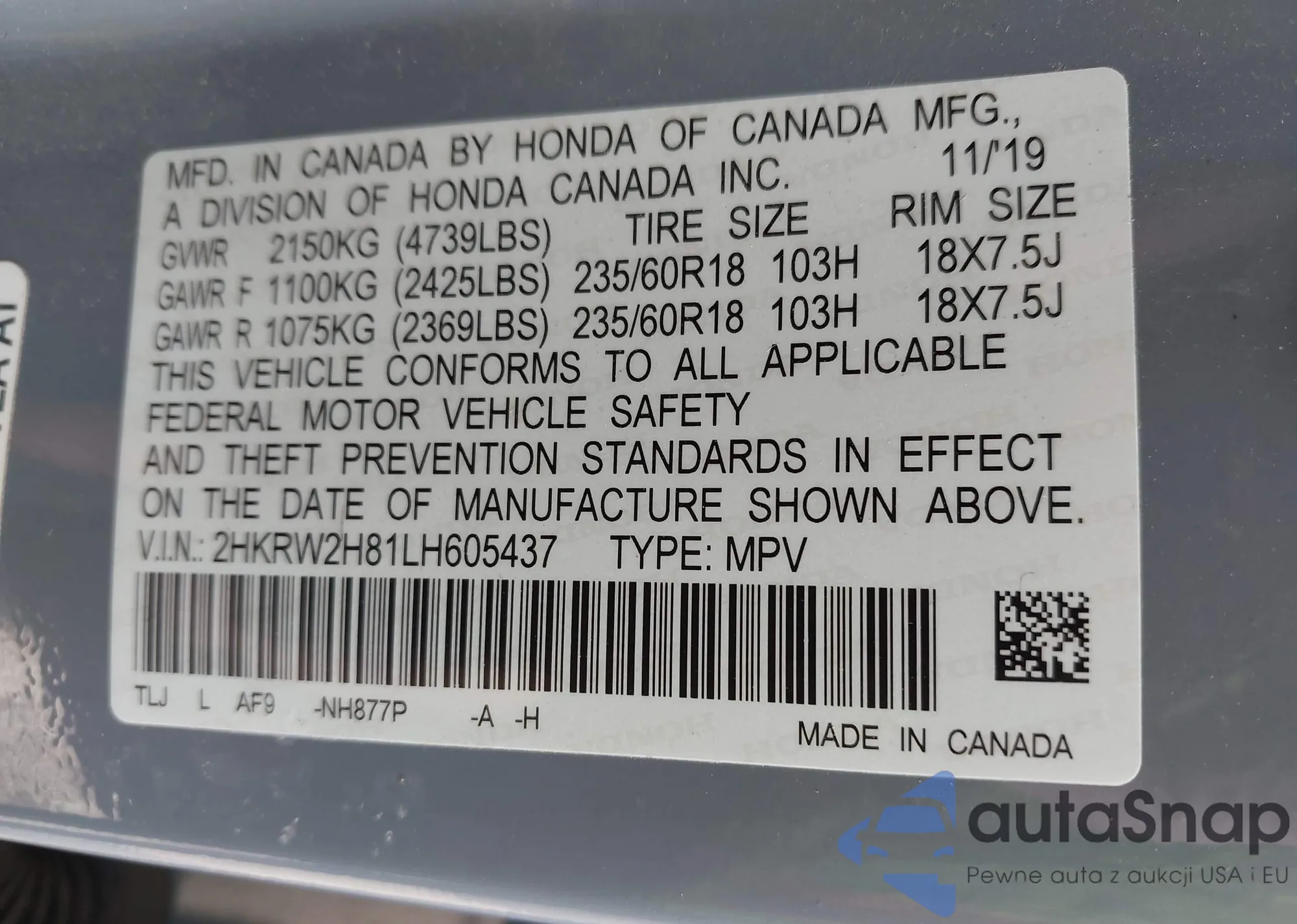 • VIN 5J6RW2H82LL011087