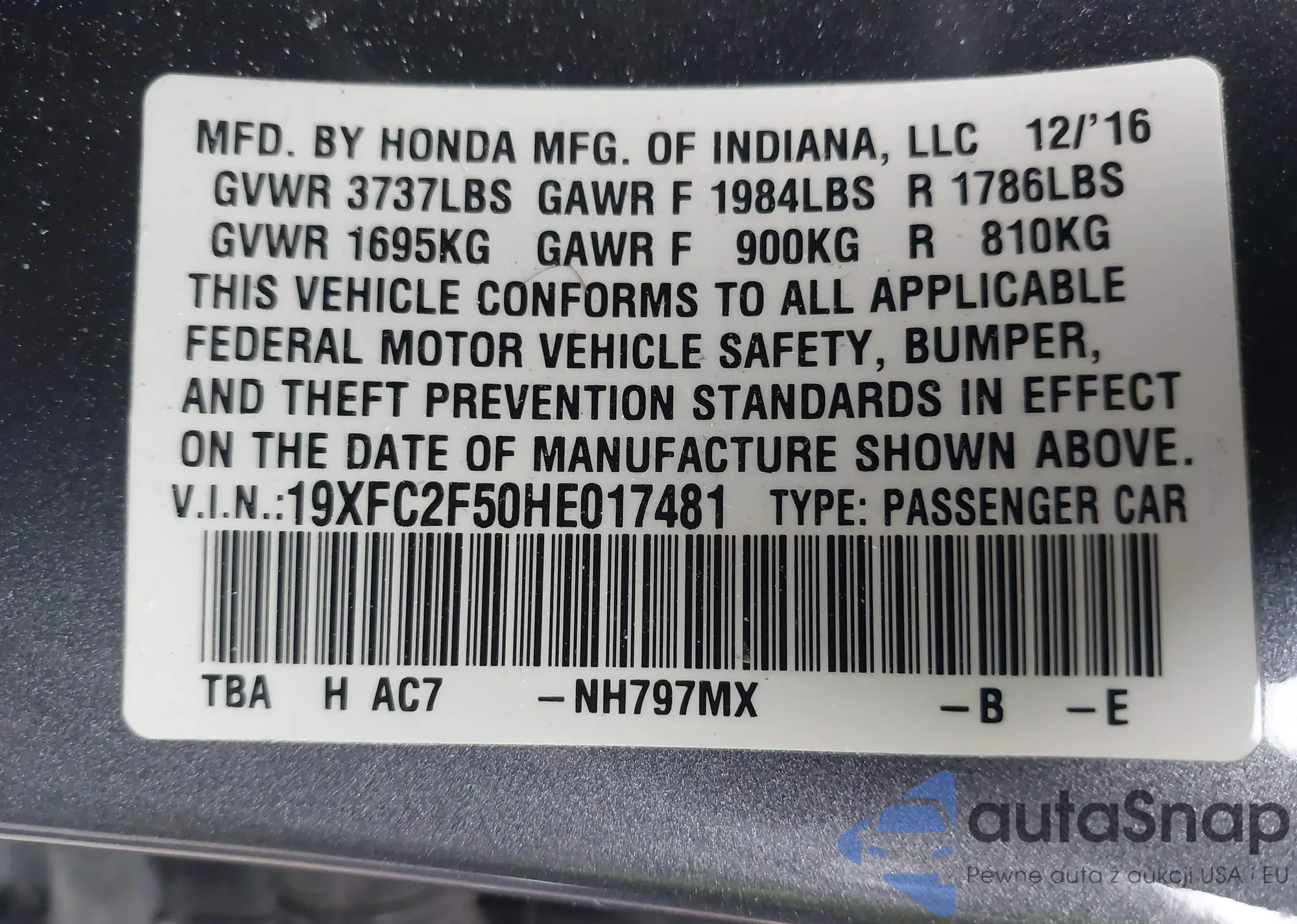 • VIN 19XFC2F50HE017481