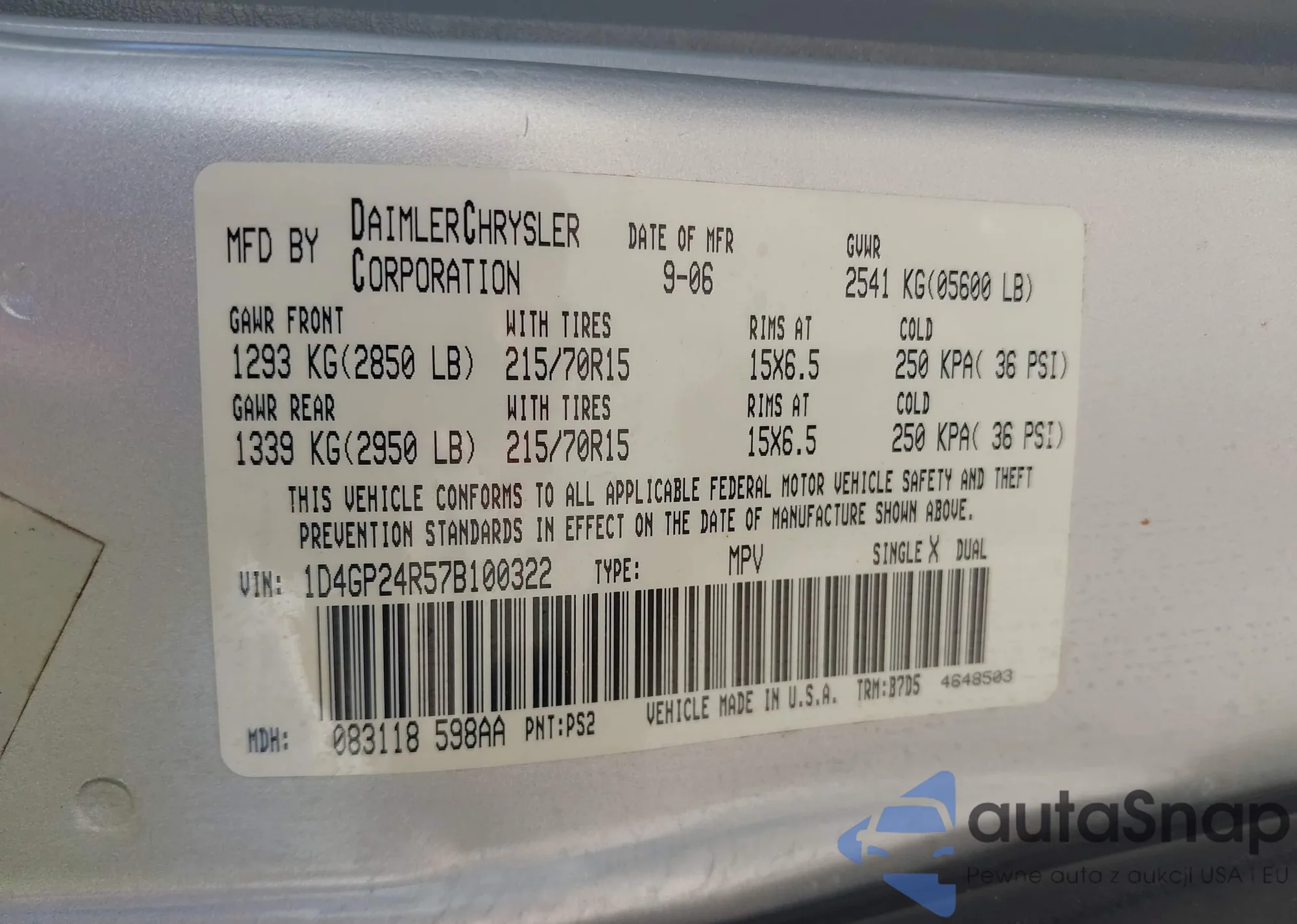 LOT: 44275495 VIN: 1D4GP24R57B100322