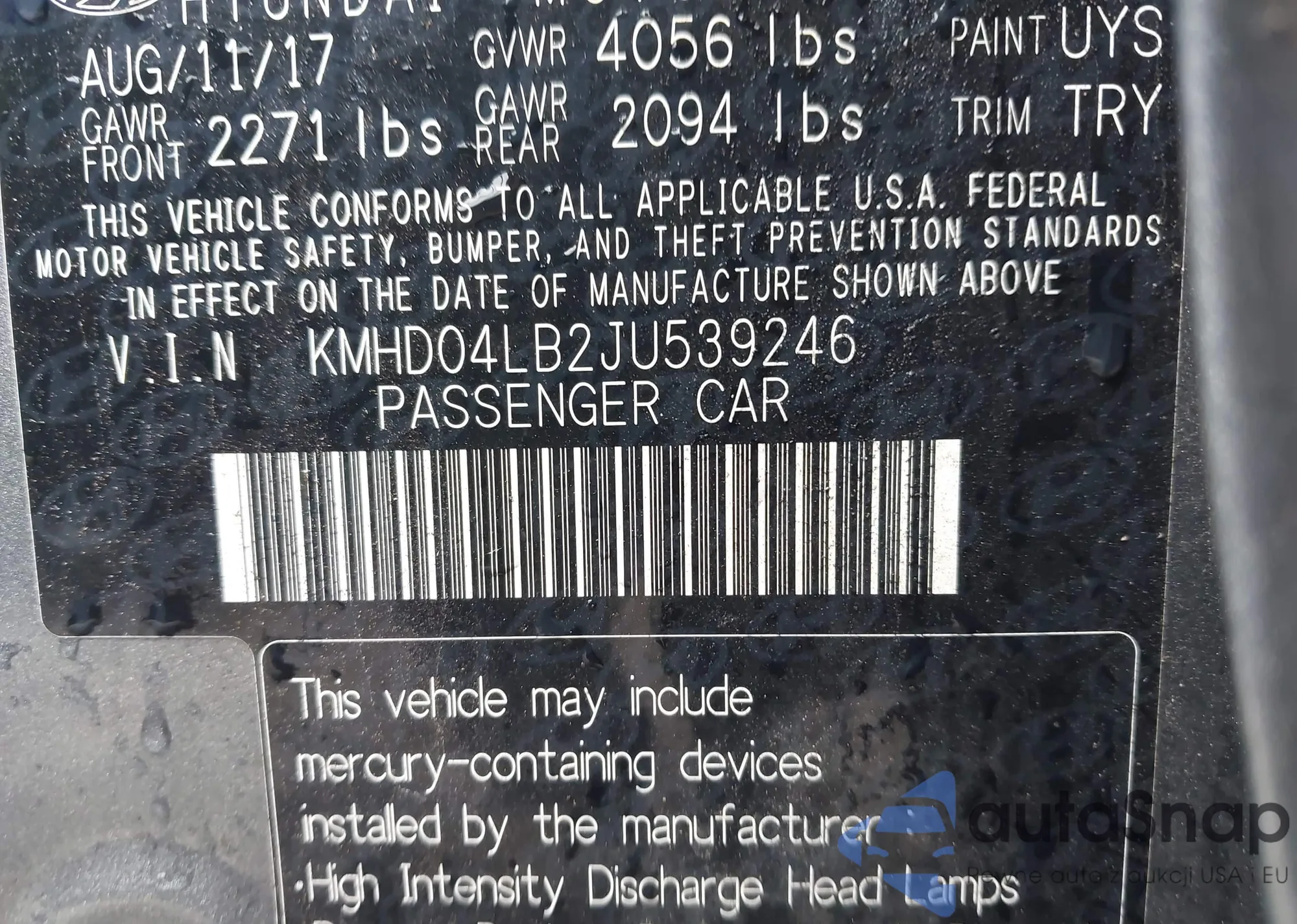 • VIN KMHD04LB2JU539246