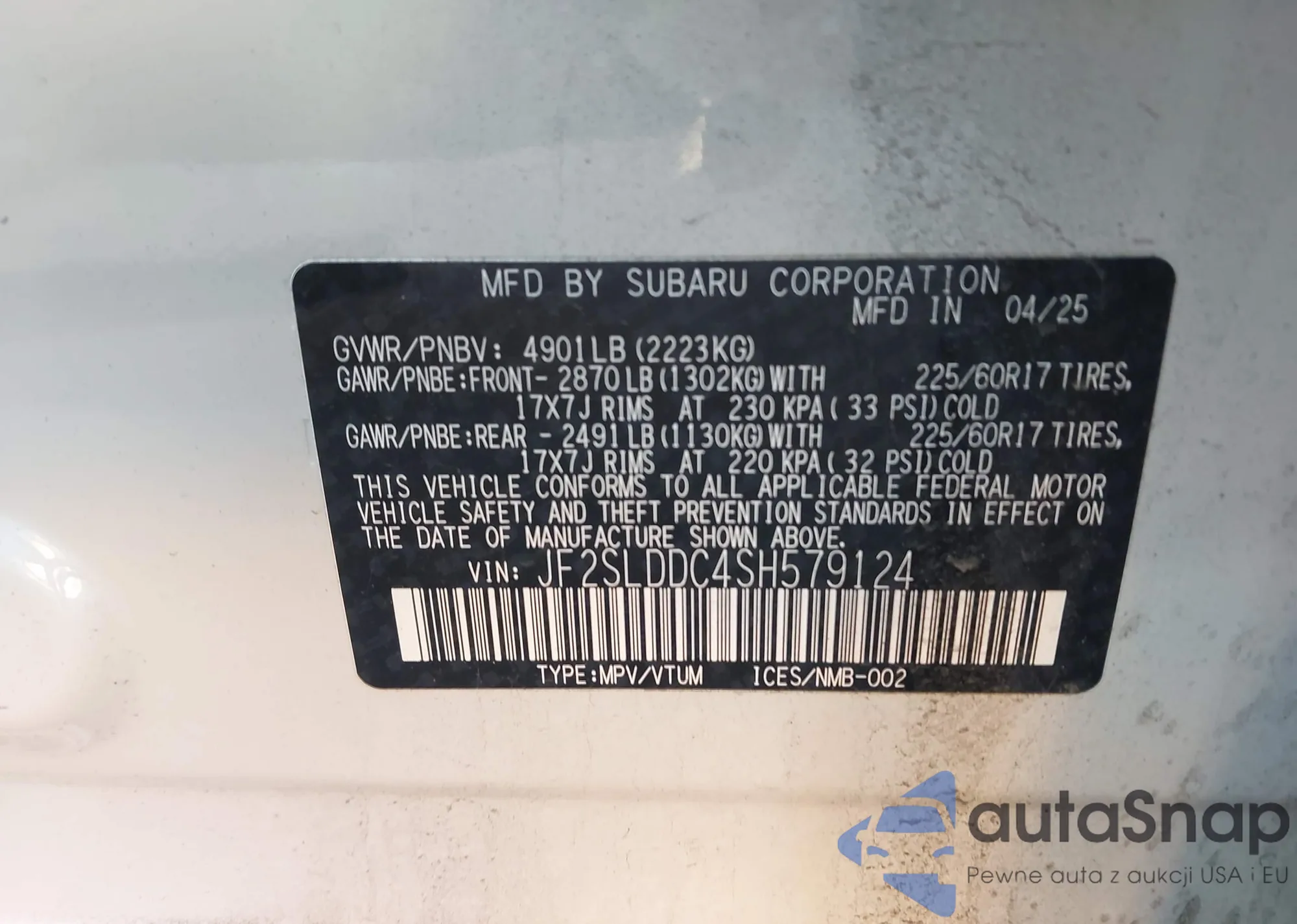 LOT: 44386281 VIN: JF2SLDDC4SH579124