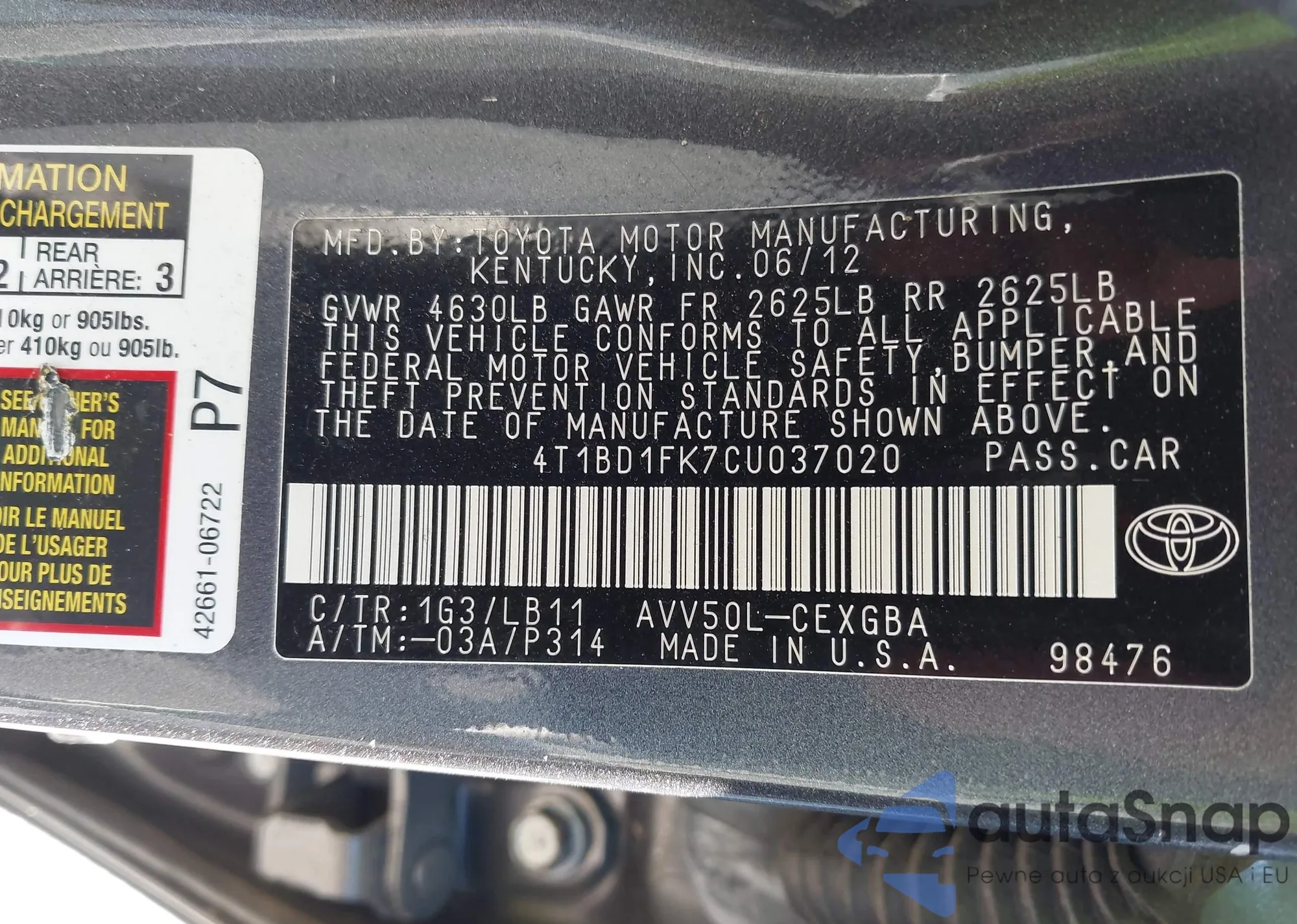 • VIN 4T1BD1FK7CU037020