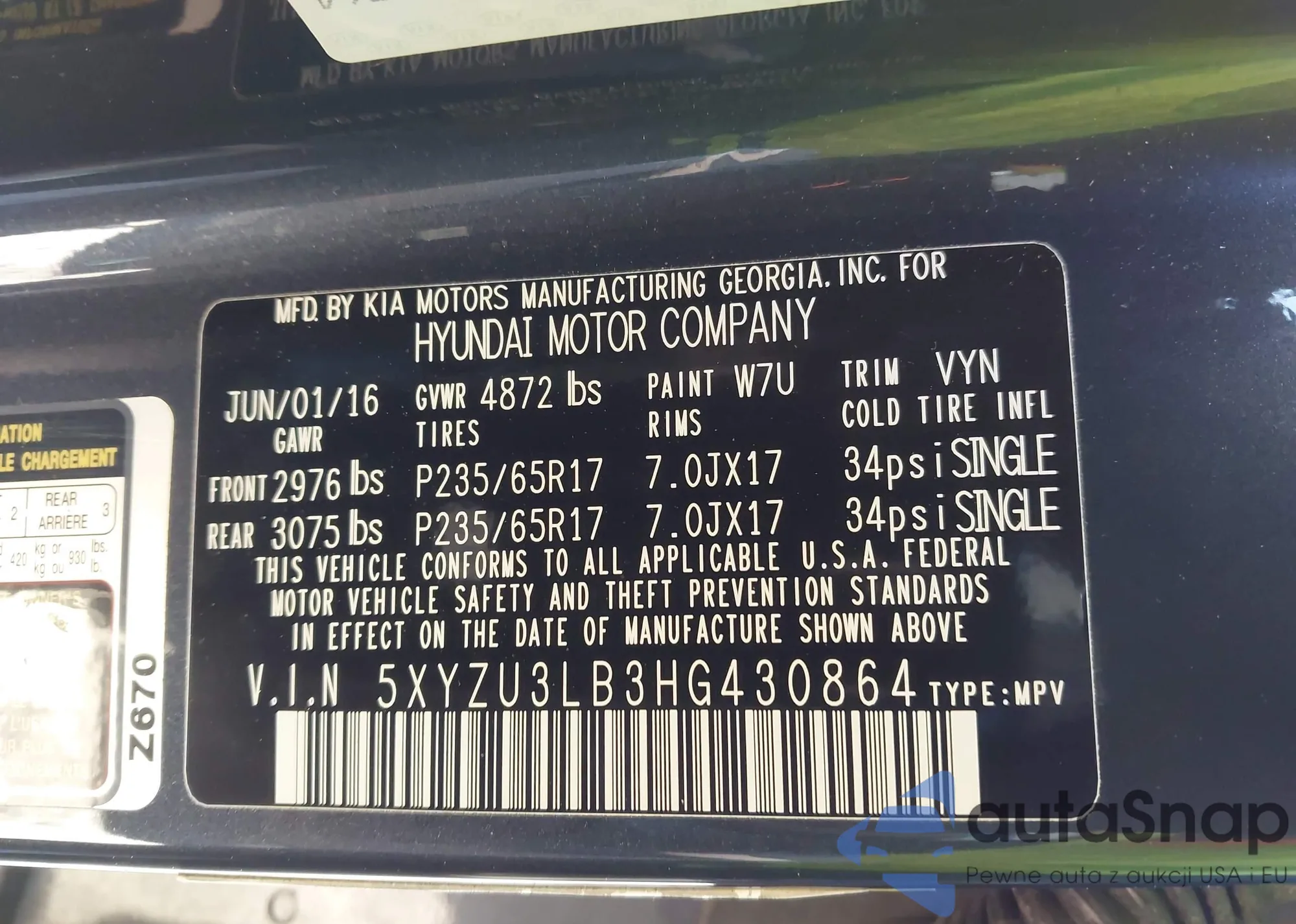 • VIN 5XYZU3LB3HG430864