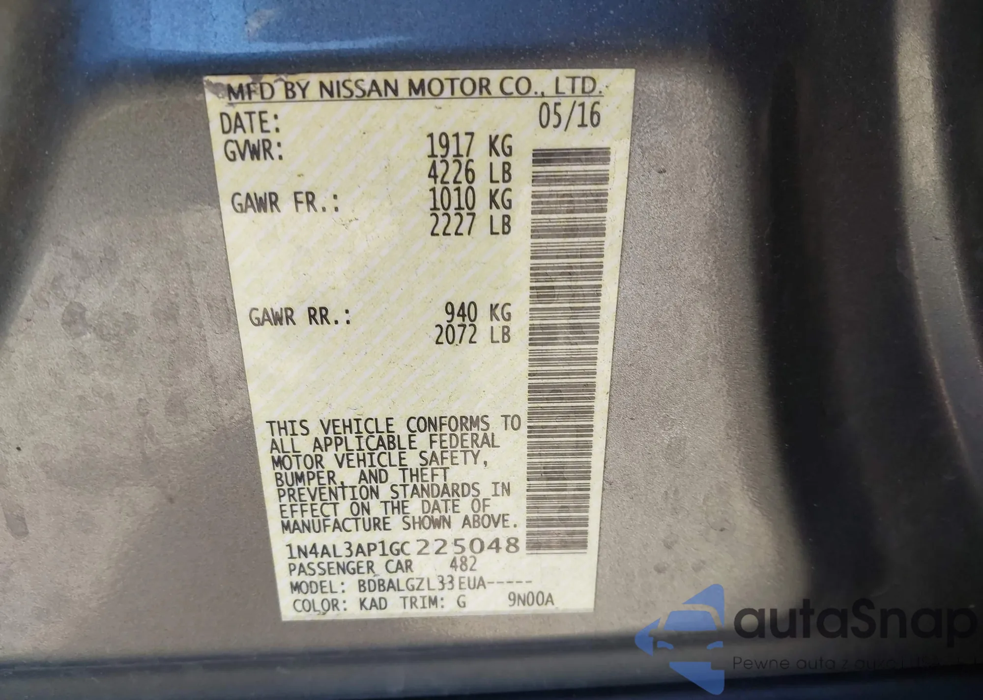 • VIN 1N4AL3AP1GC225048