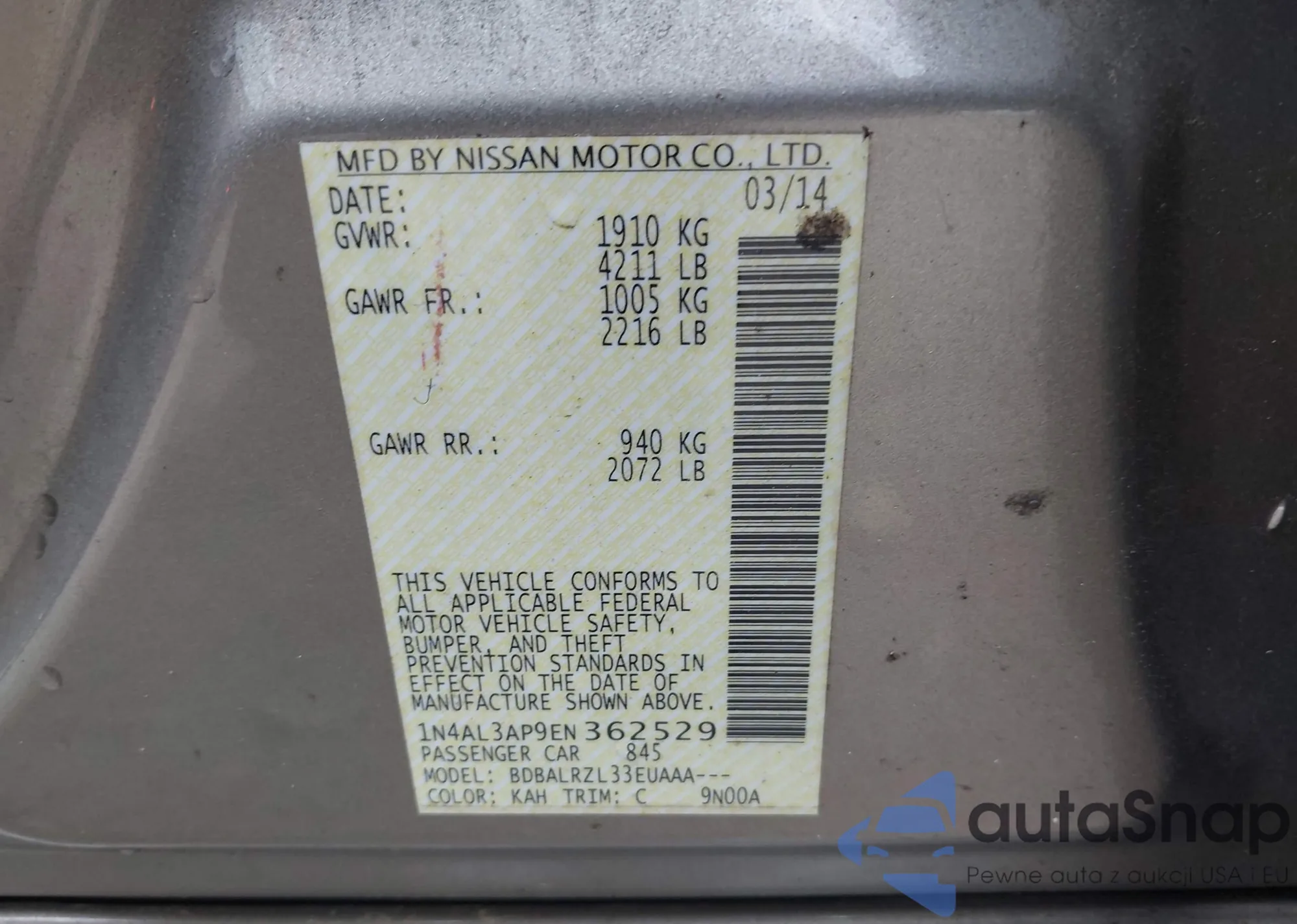 • VIN 1N4AL3AP9EN362529