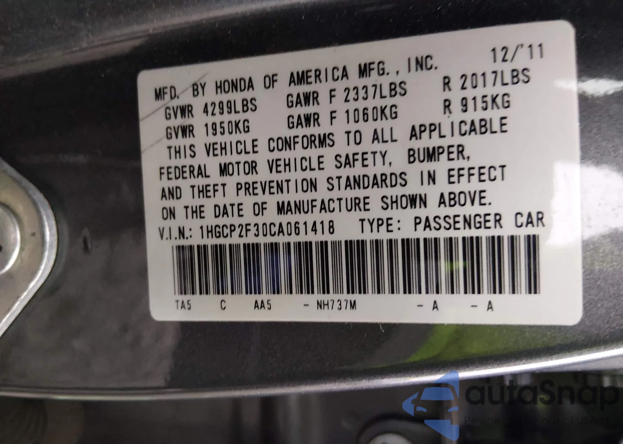 LOT: 44088577 VIN: 01HGCP2F30CA06141
