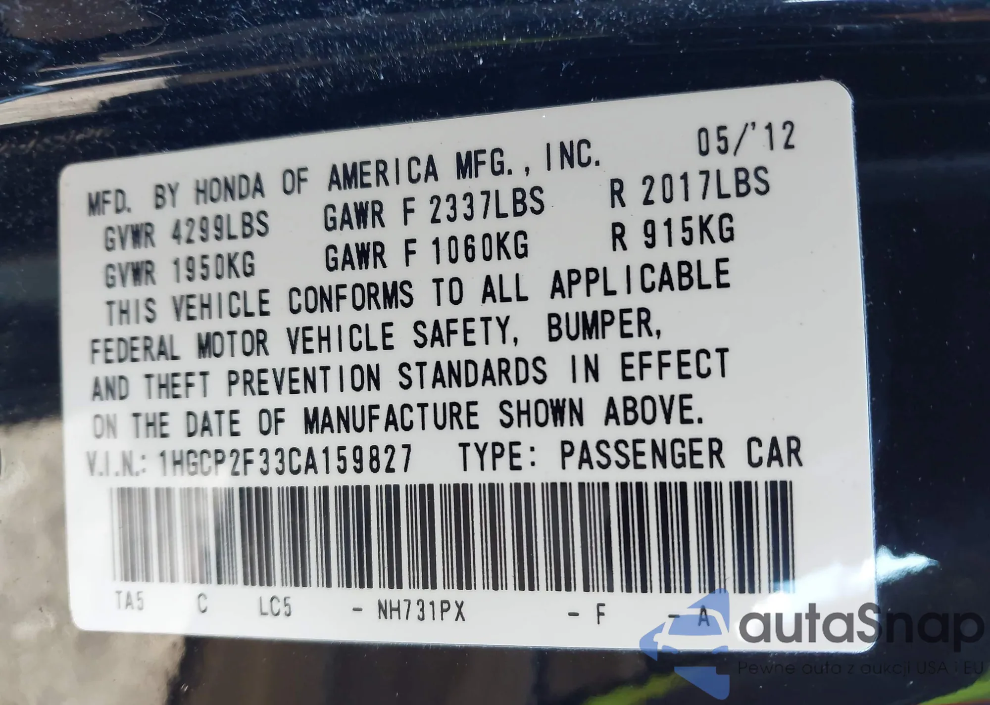 LOT: 44279660 VIN: 1HGCP2F33CA159827