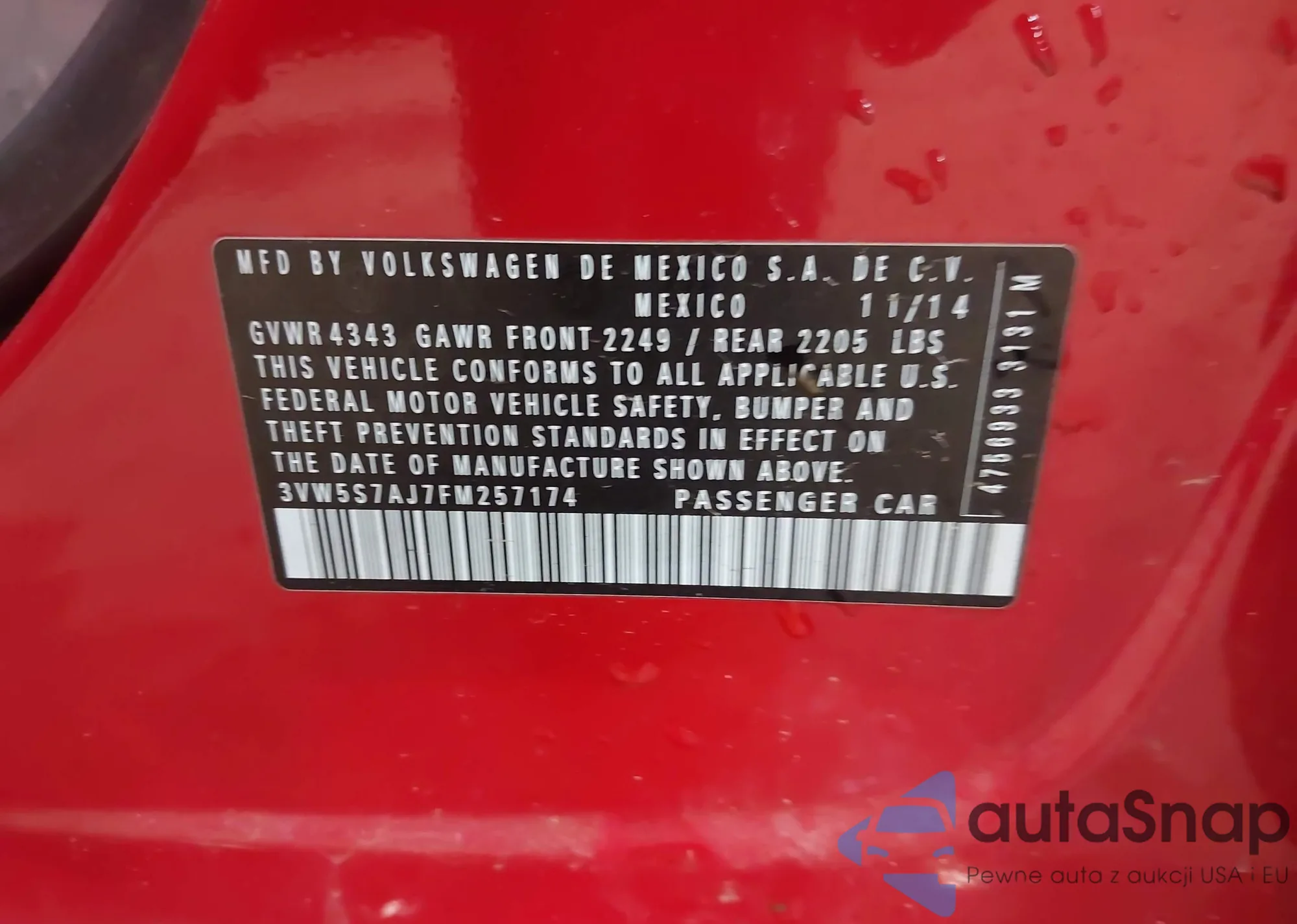 • VIN 3VW5S7AJ7FM257174