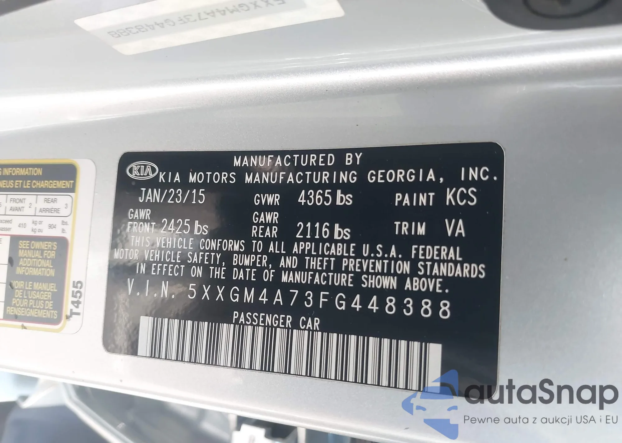 2015 Kia Optima Lx z USA, uszkodzony, nr VIN 5XXGM4A73FG448388