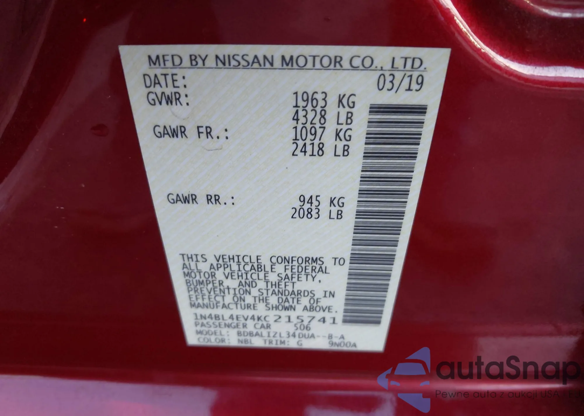LOT: 43829802 VIN: 1N4BL4EV4KC215741