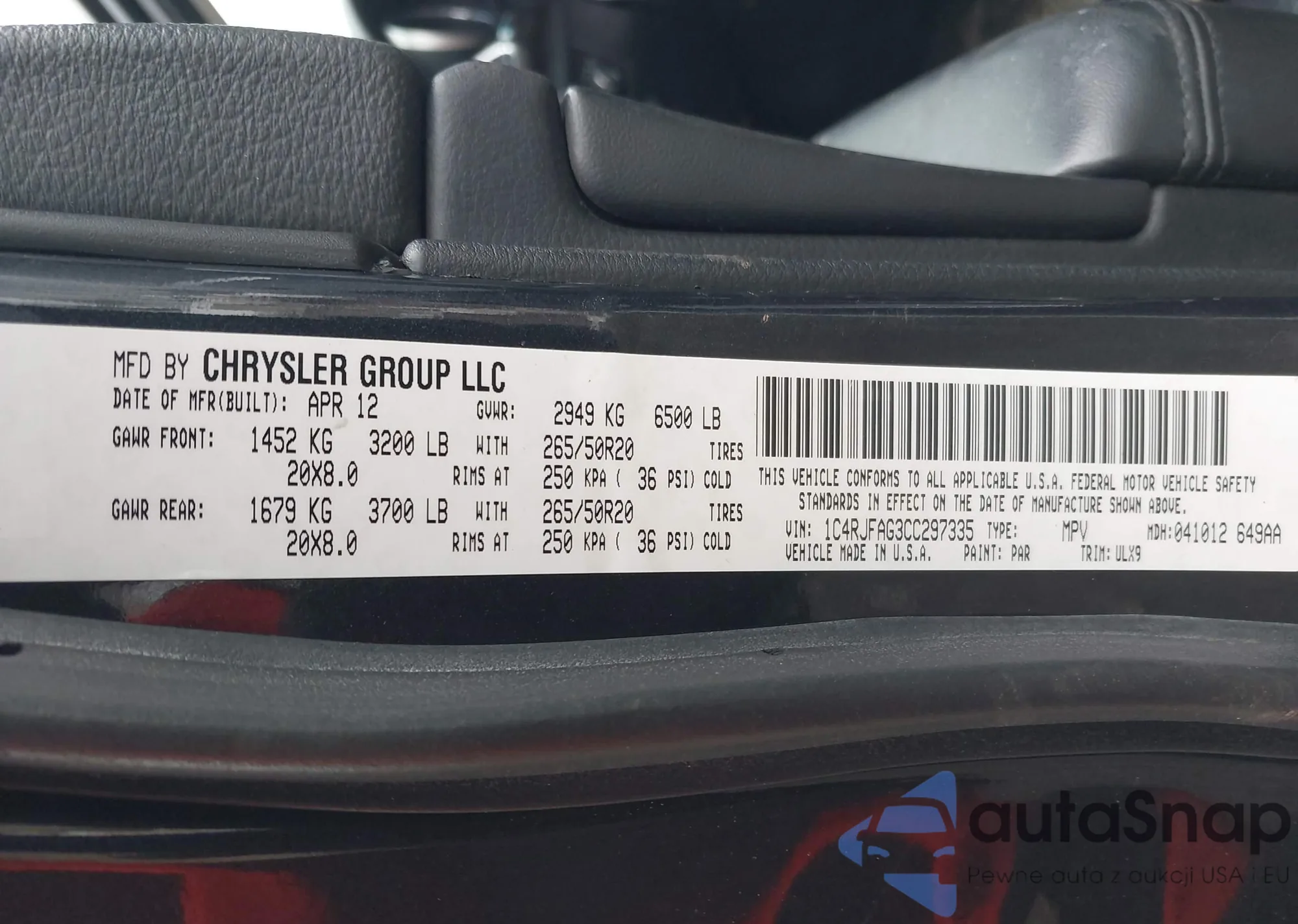 • VIN 1C4RJFAG3CC297335