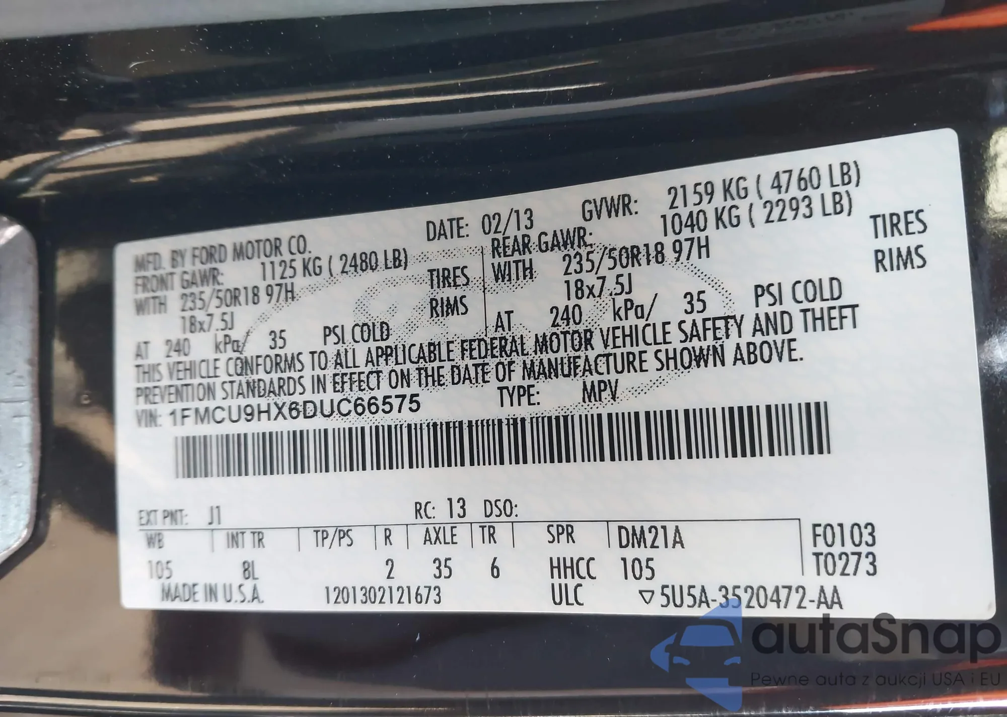 • VIN 1FMCU9HX6DUC66575