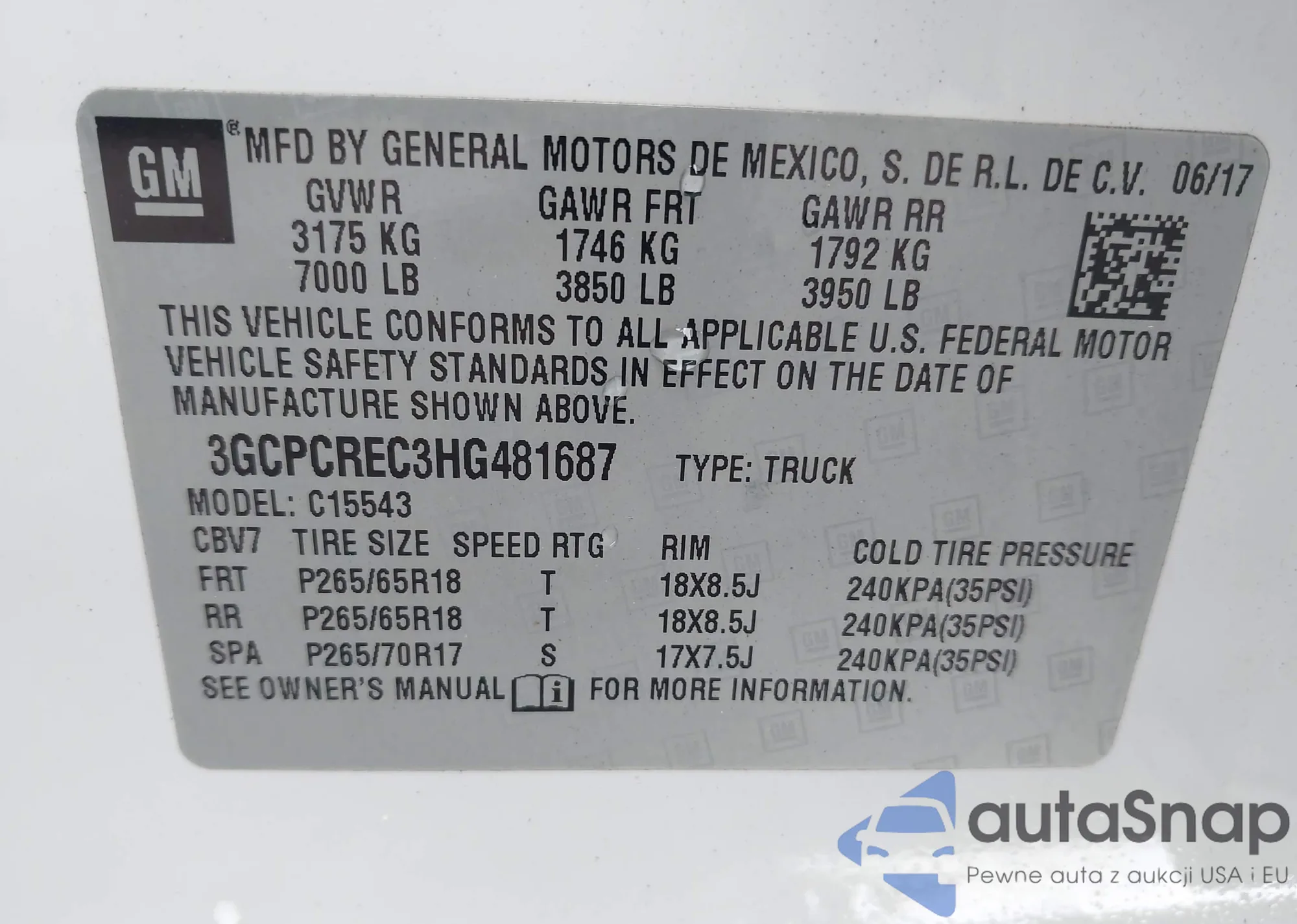 • VIN 3GCPCREC3HG481687