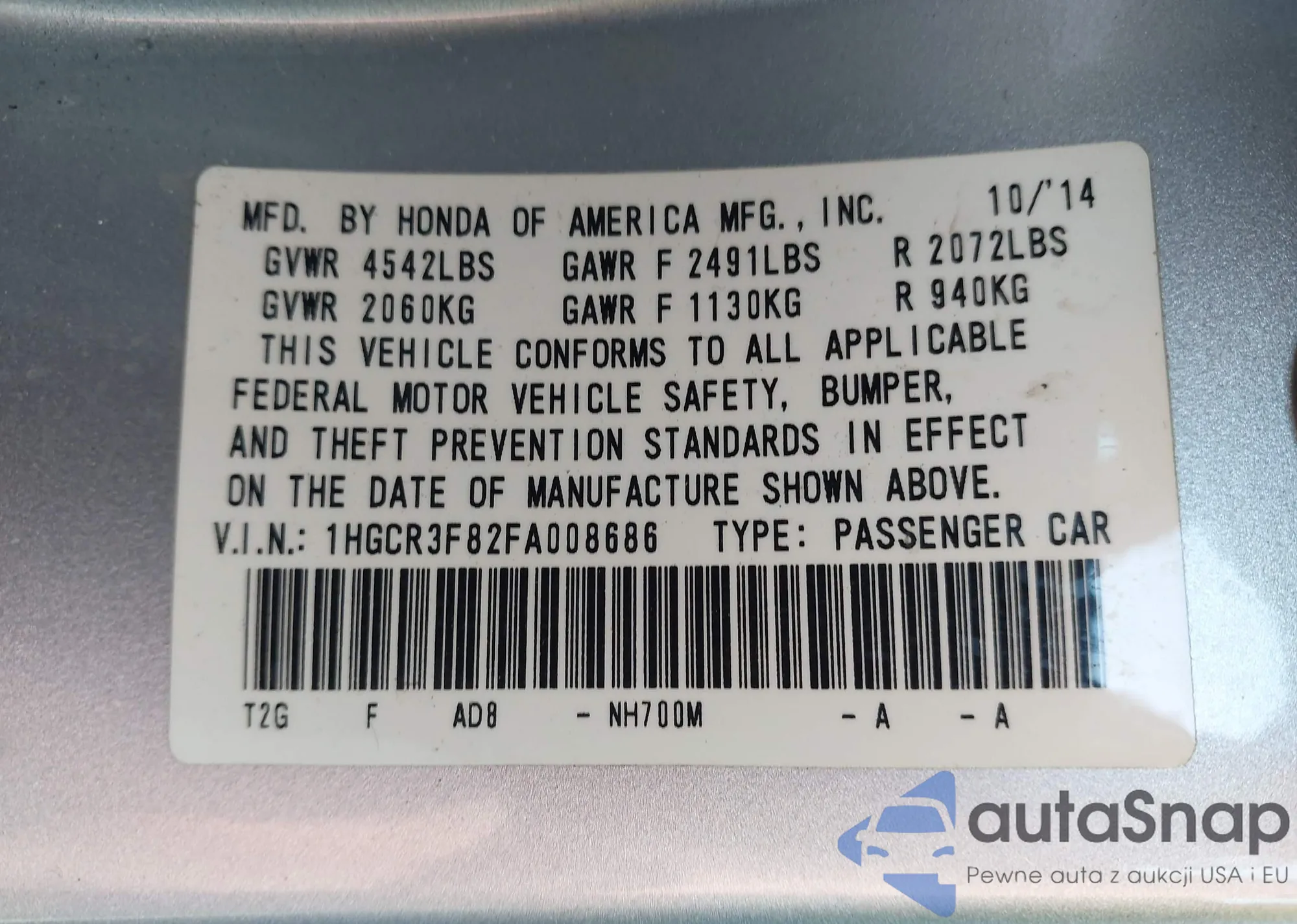• VIN 1HGCR3F82FA008686