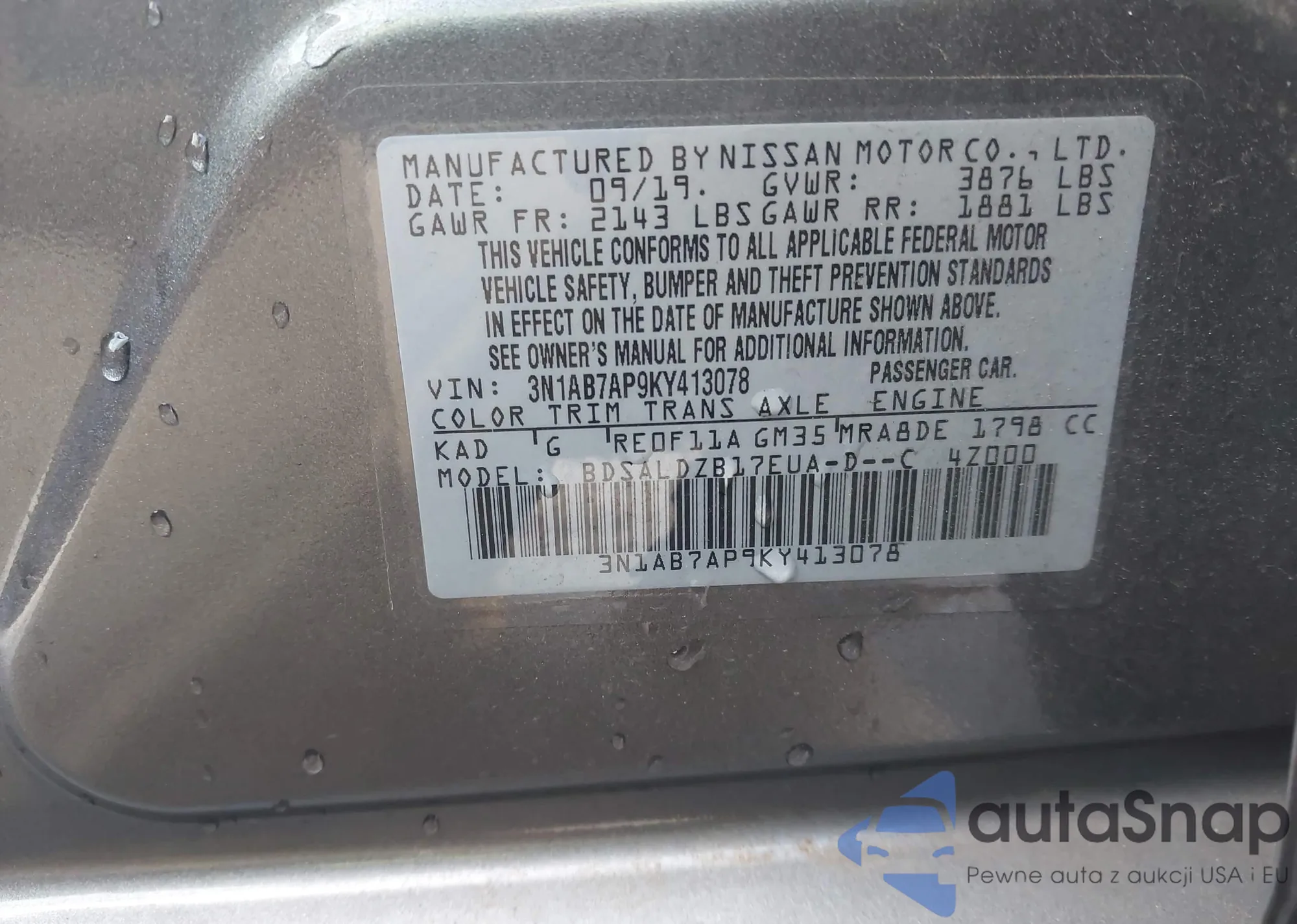 LOT: 43987476 VIN: 3N1AB7AP9KY413078