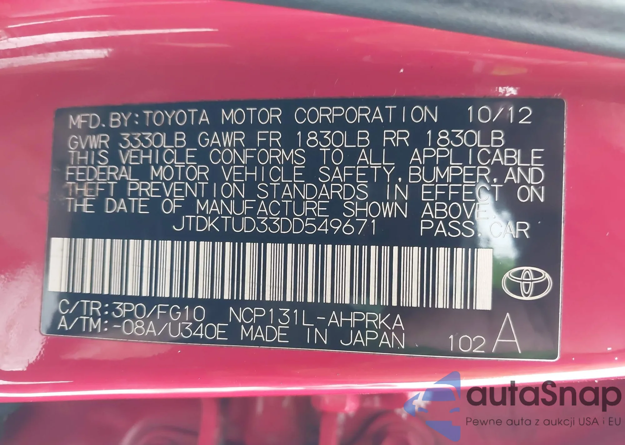 • VIN JTDKTUD33DD549671