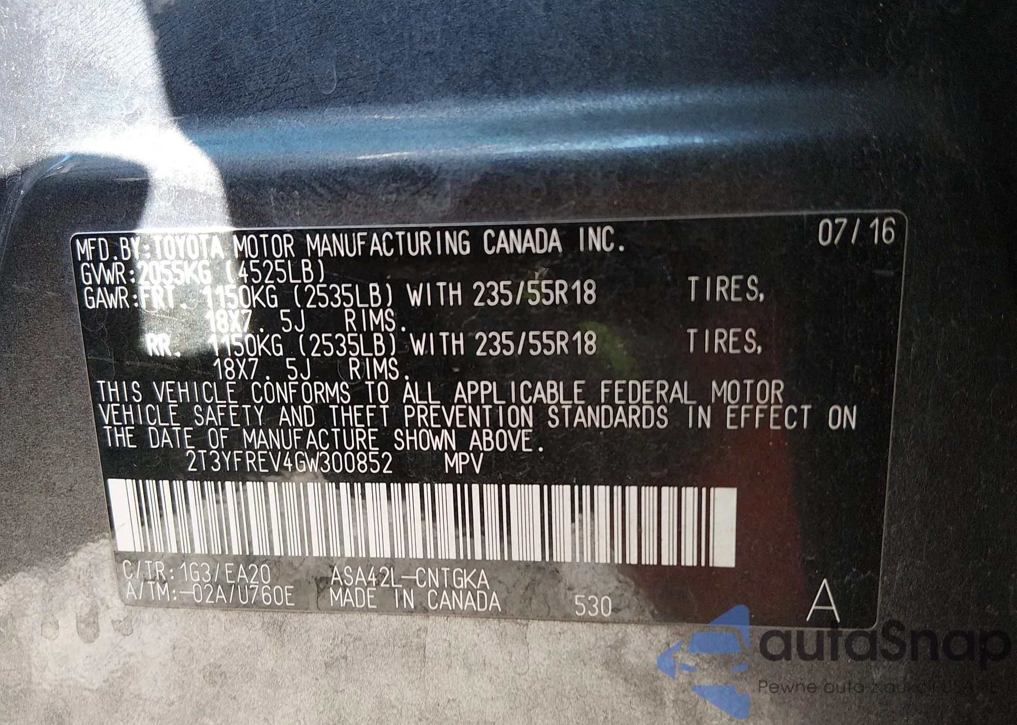 LOT: 44192853 VIN: 2T3YFREV4GW300852