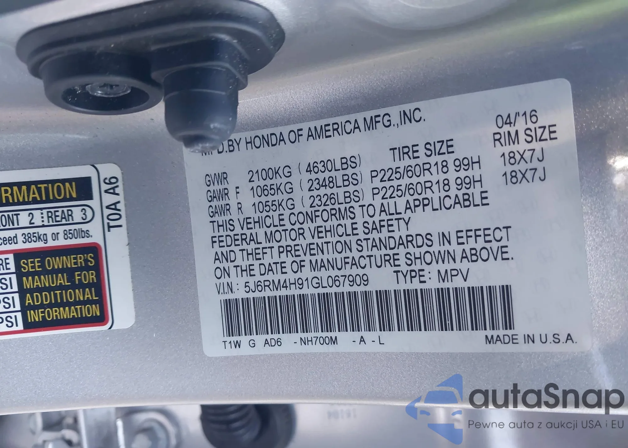 • VIN 5J6RM4H91GL067909