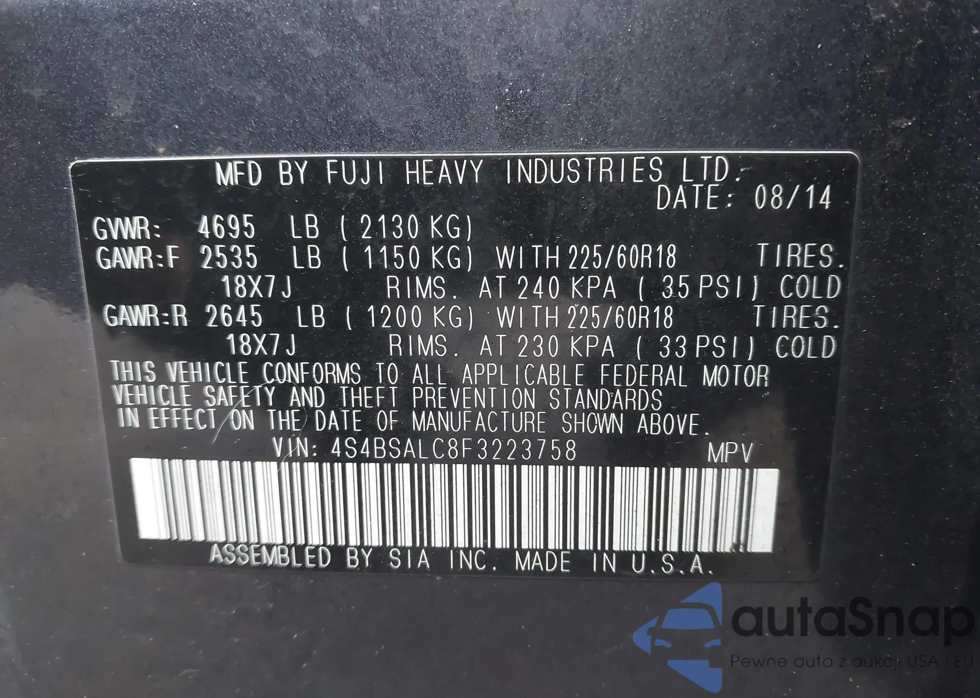 • VIN 4S4BSALC8F3223758