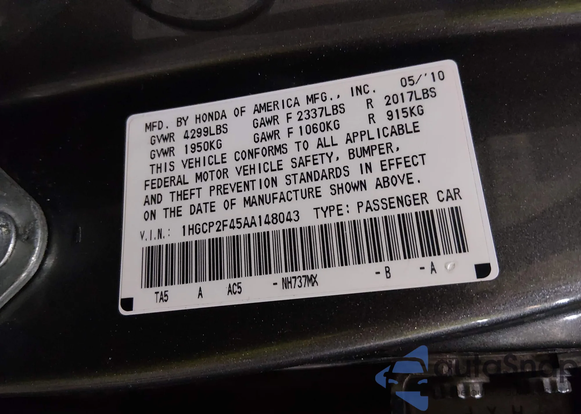 LOT: 44351565 VIN: 1HGCP2F45AA148043