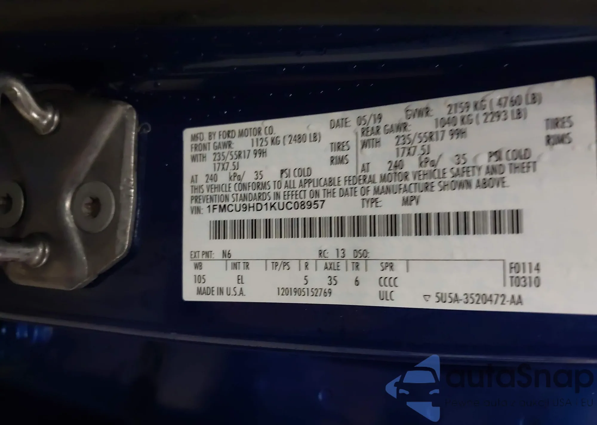 • VIN 1FMCU9HD1KUC08957