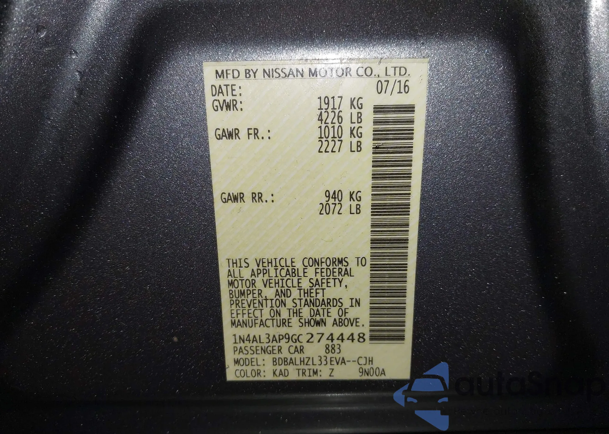 • VIN 1N4AL3AP9GC274448