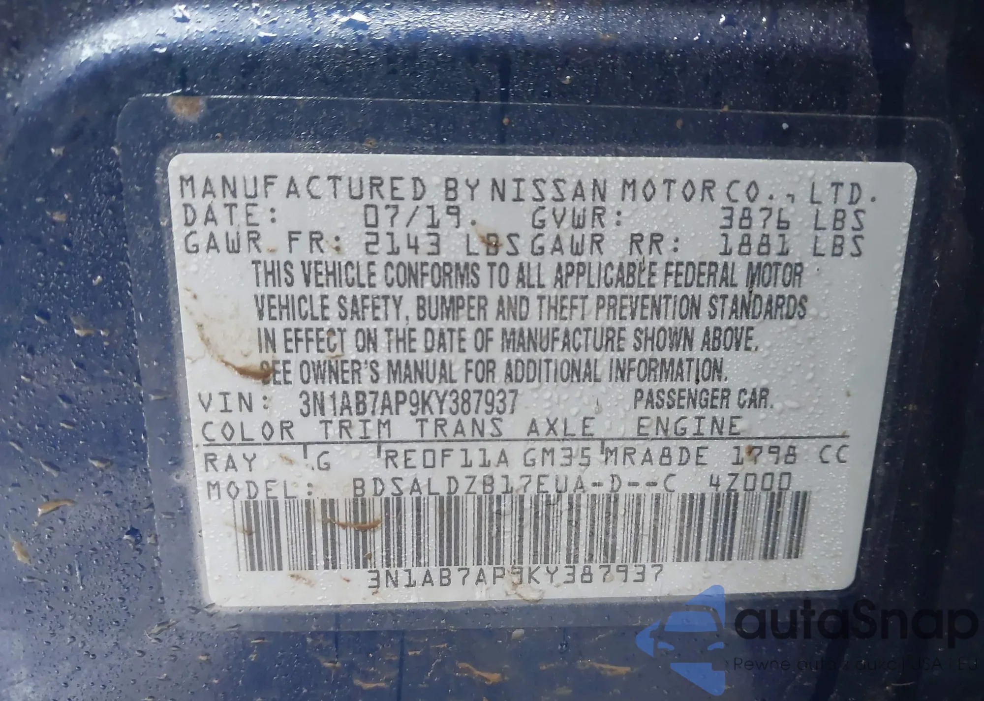• VIN 3N1AB7AP9KY387937