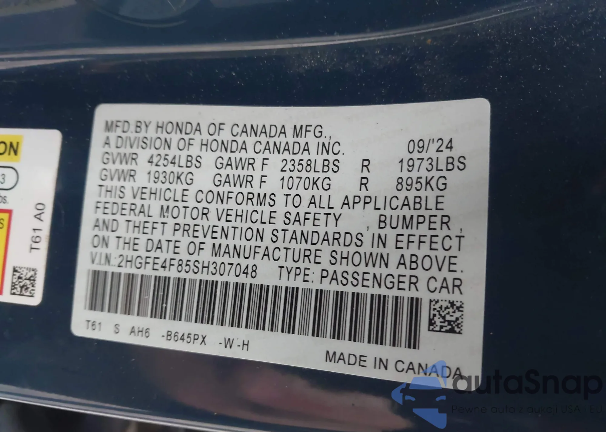 • VIN 2HGFE4F85SH307048