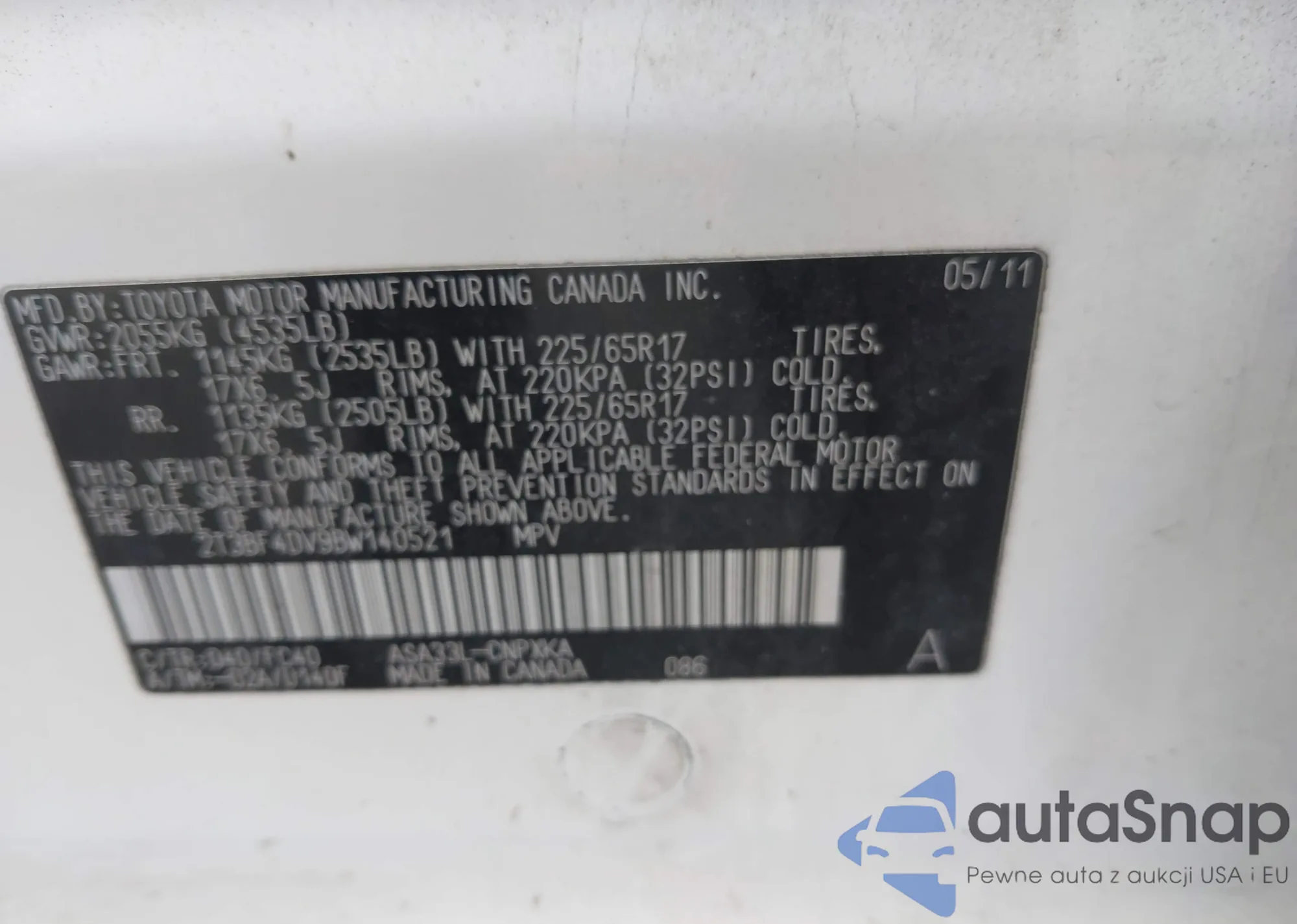 • VIN 2T3BF4DV9BW140521