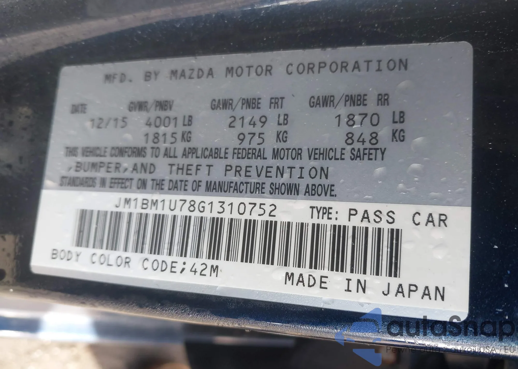 LOT: 44423193 VIN: JM1BM1U78G1310752