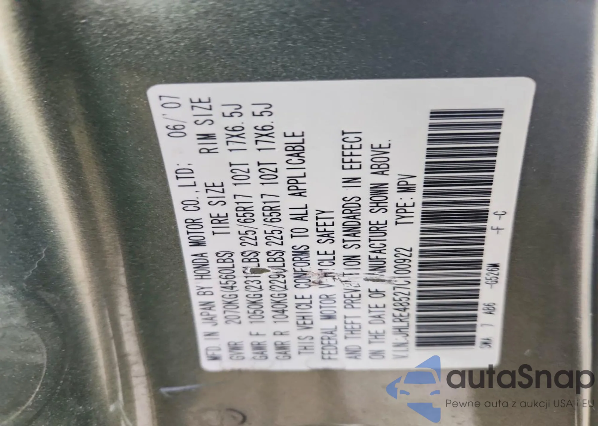 • VIN JHLRE48527C100922
