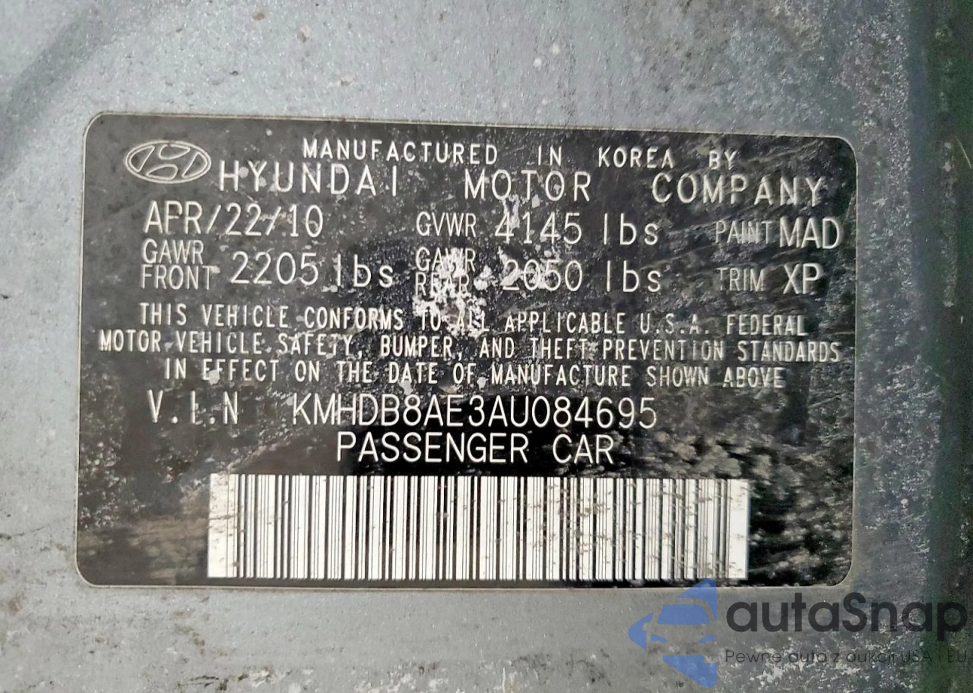 • VIN KMHDB8AE3AU084695