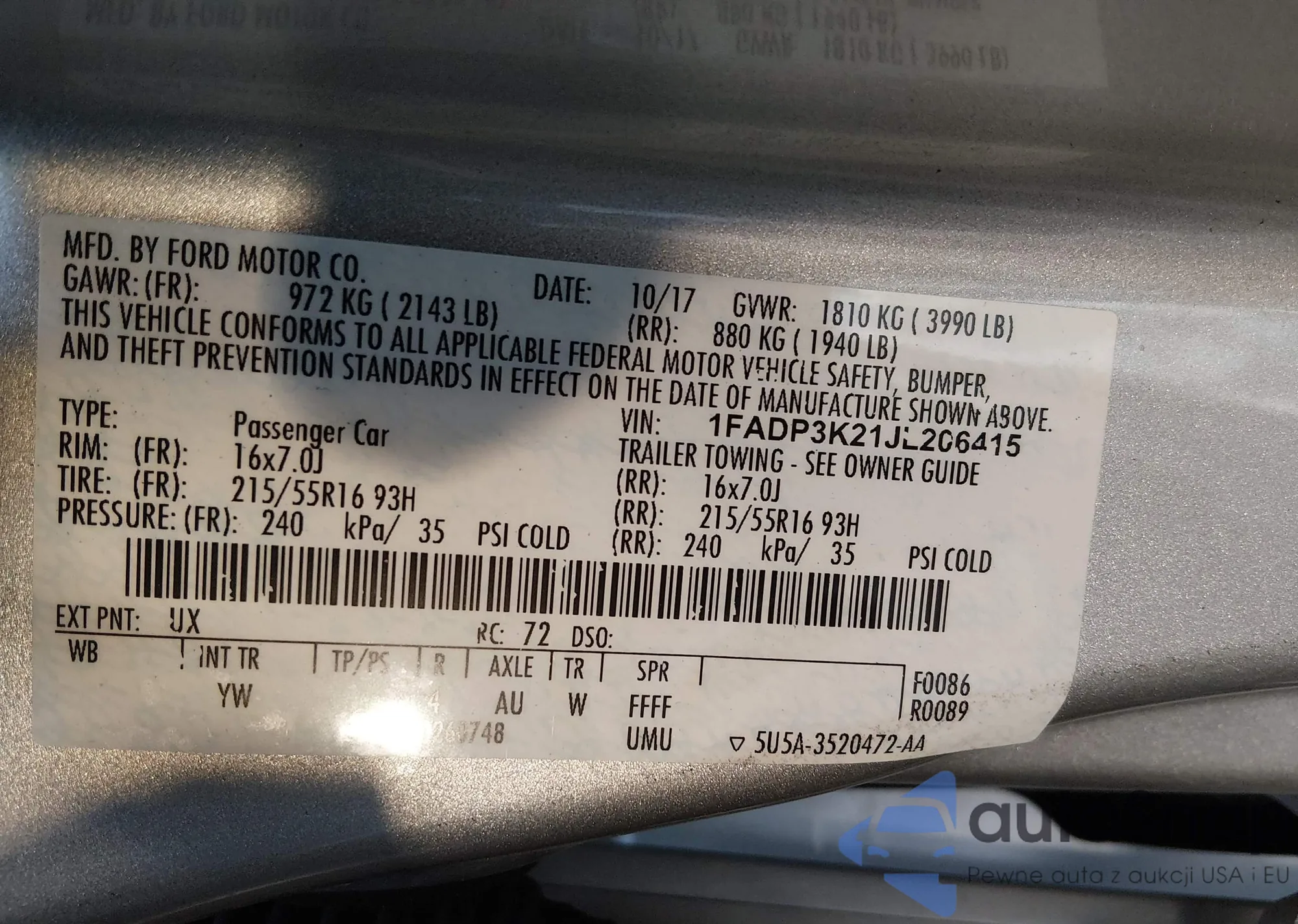 LOT: 44209916 VIN: 1FADP3K21JL206415