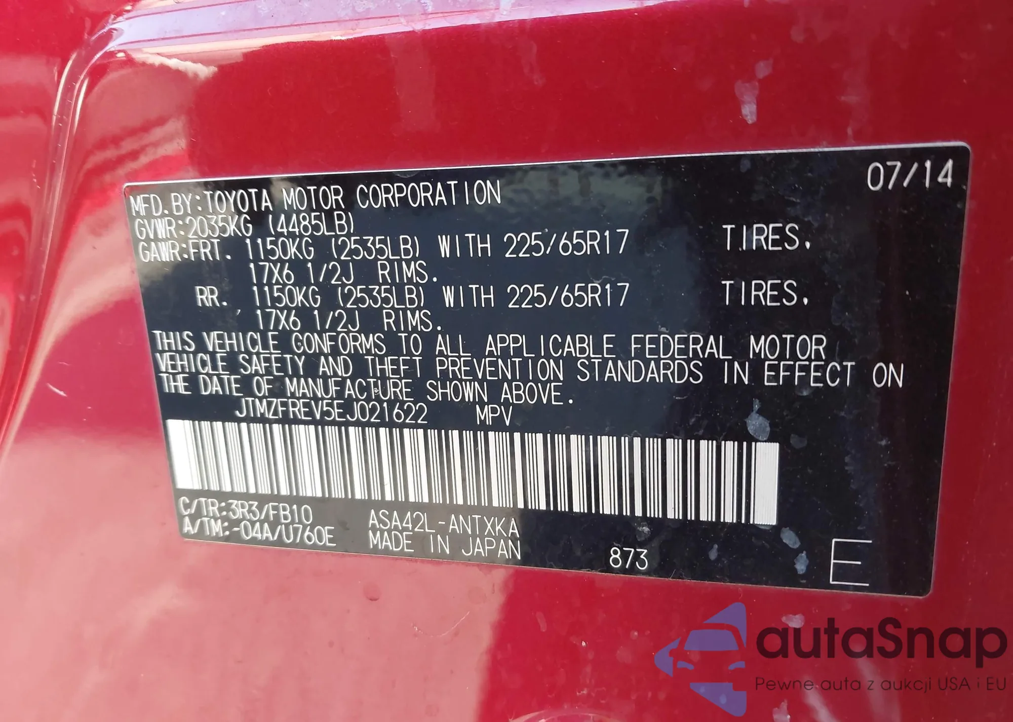 • VIN JTMZFREV5EJ021622