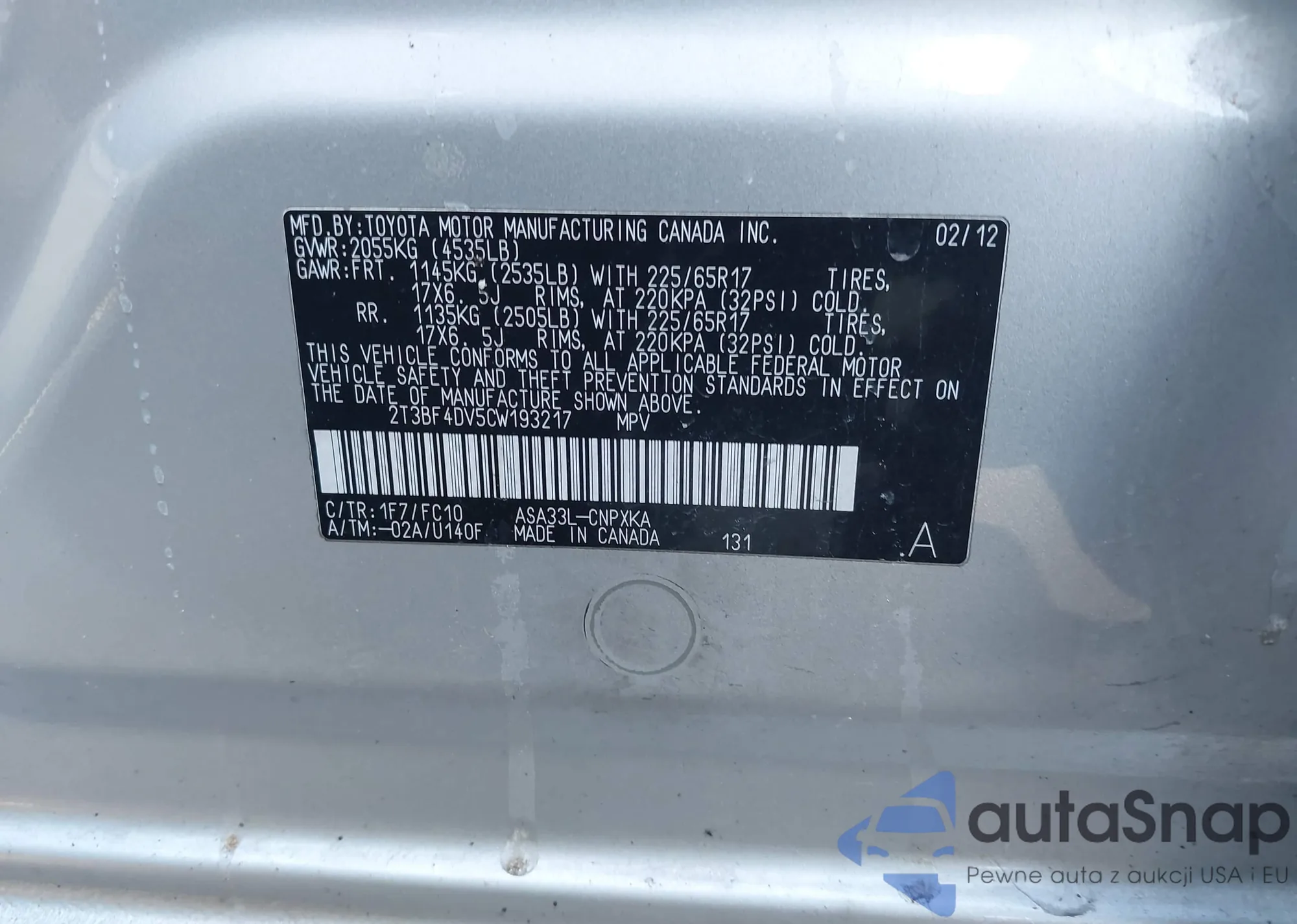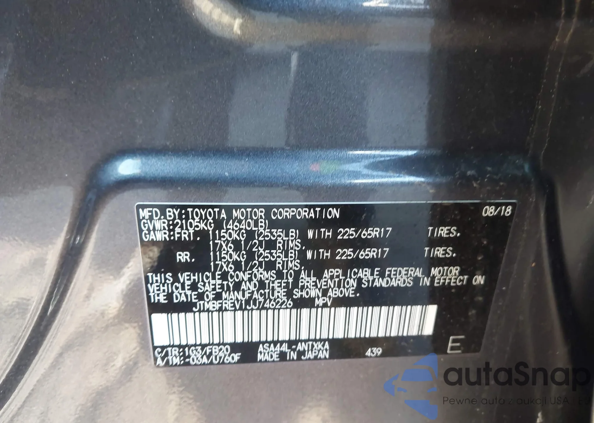 LOT: 44141760 VIN: JTMBFREV1JJ746226