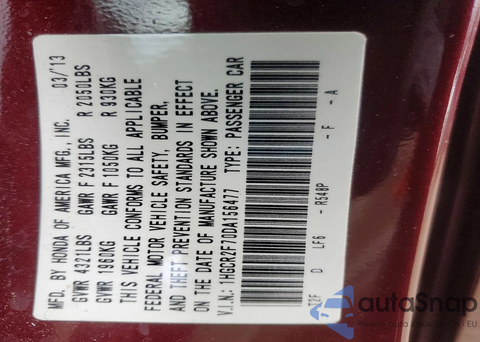 LOT: 99661315 VIN: 1HGCR2F70DA156477