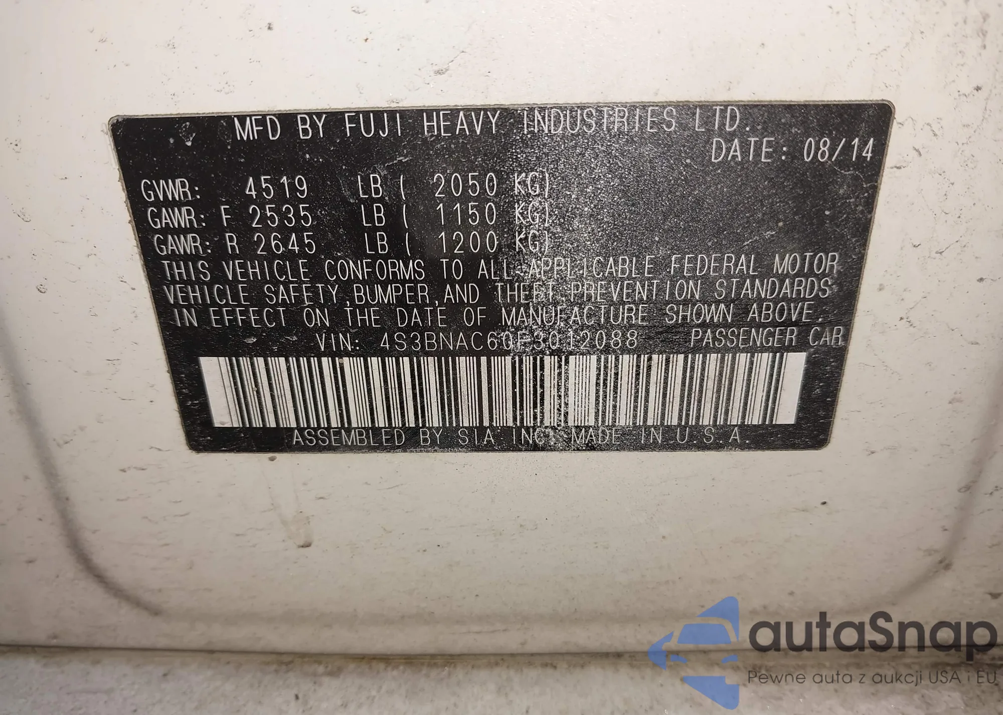 LOT: 44360666 VIN: 4S3BNAC60F3012088