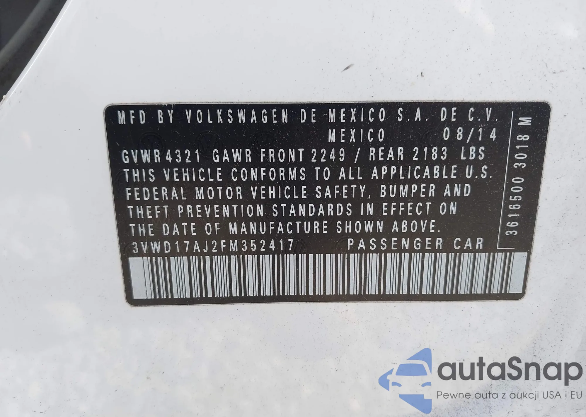 • VIN 3VWD17AJ2FM352417