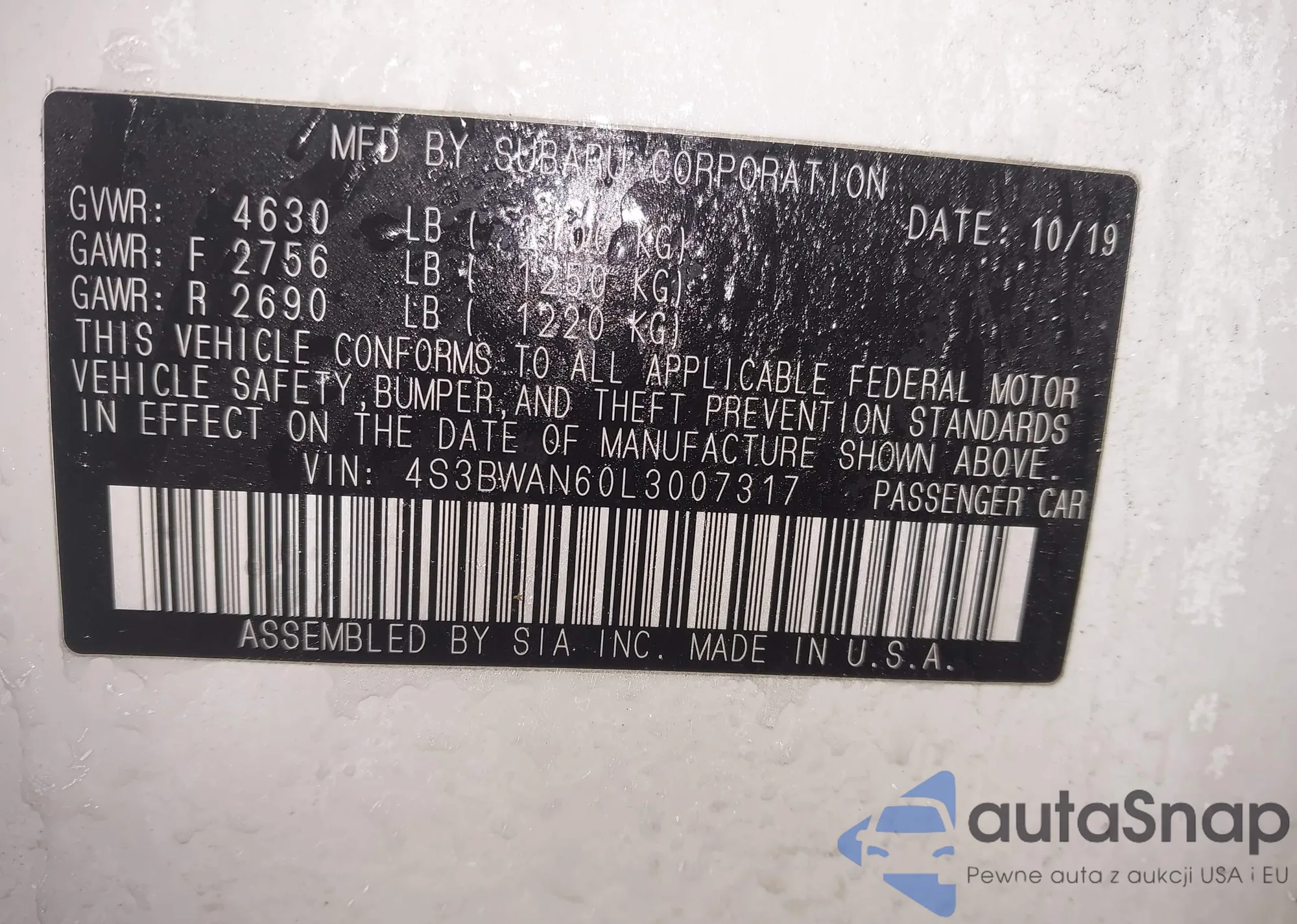 • VIN 4S3BWAN60L3007317
