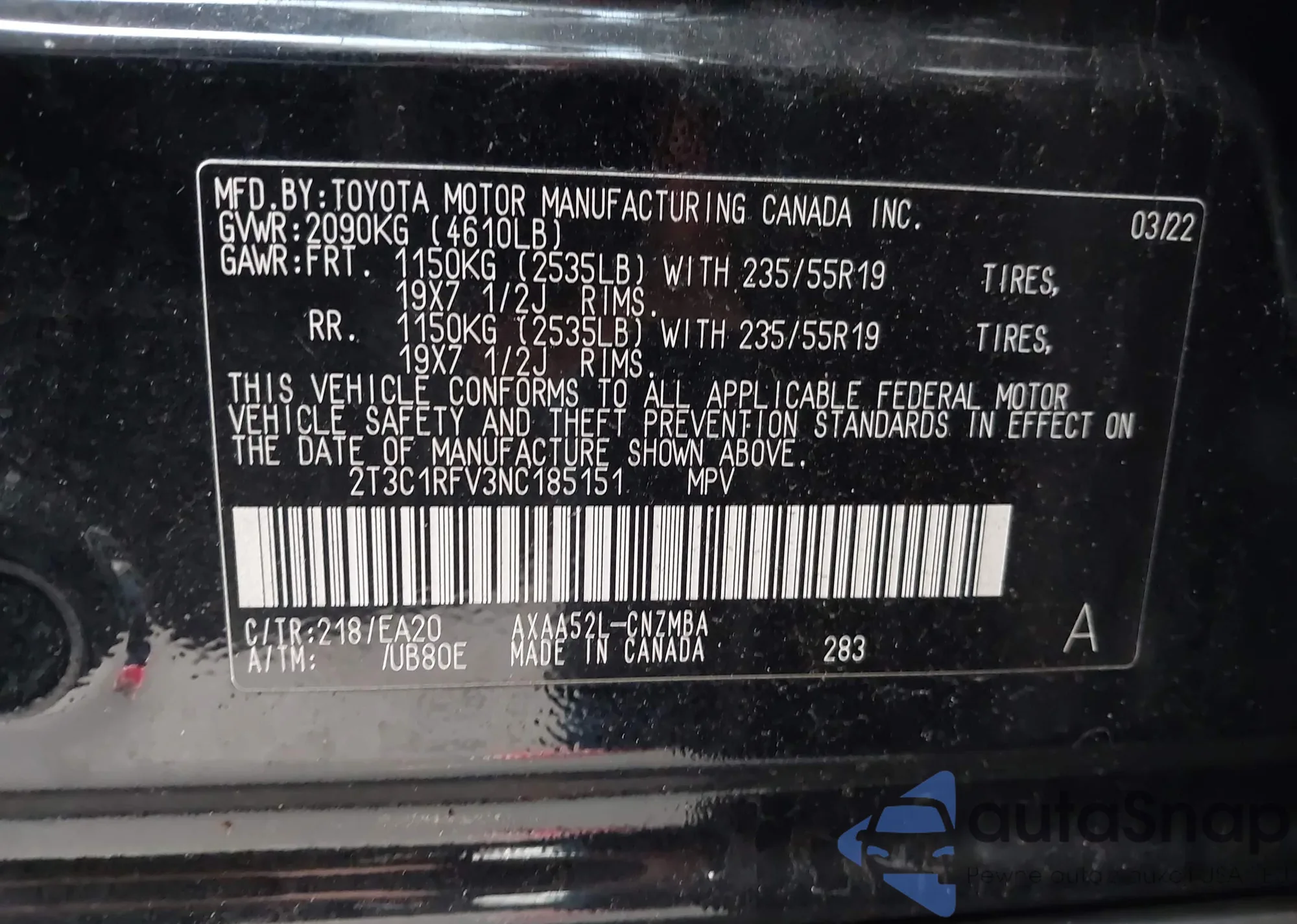 LOT: 44248214 VIN: 2T3C1RFV3NC185151