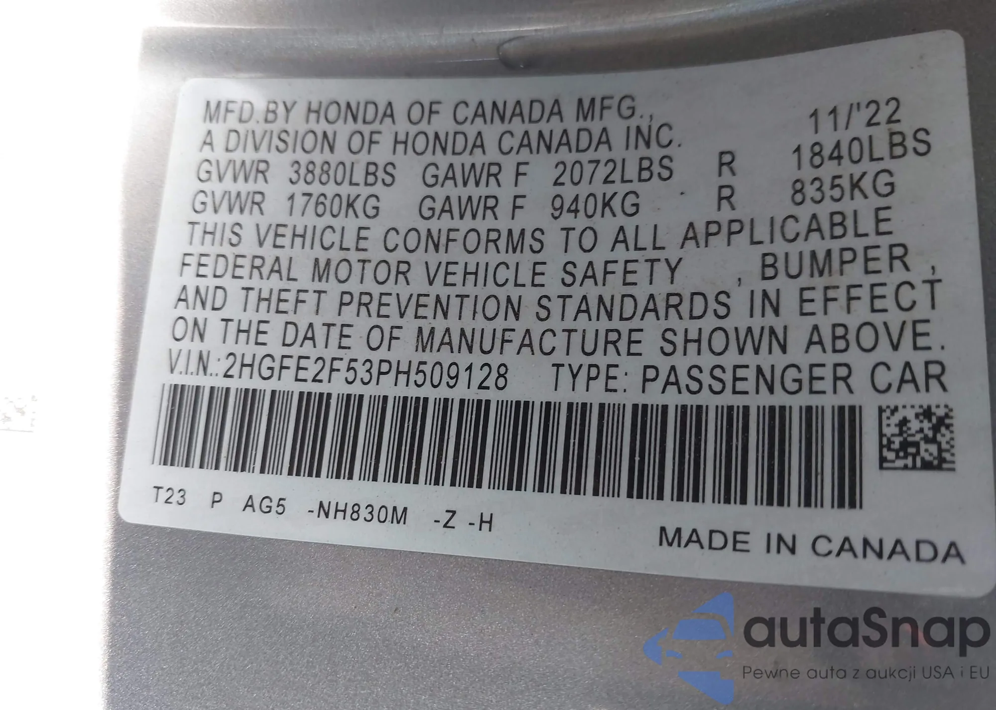 LOT: 43660978 VIN: 2HGFE2F53PH509128