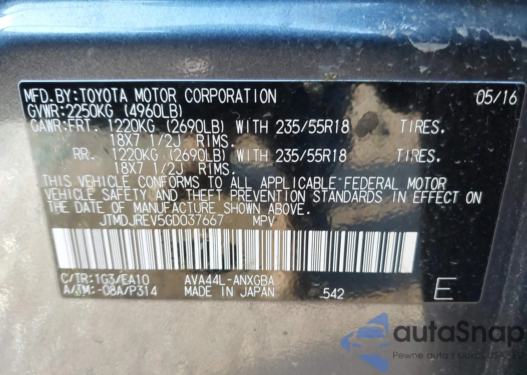 LOT: 44095052 VIN: JTMDJREV5GD037667