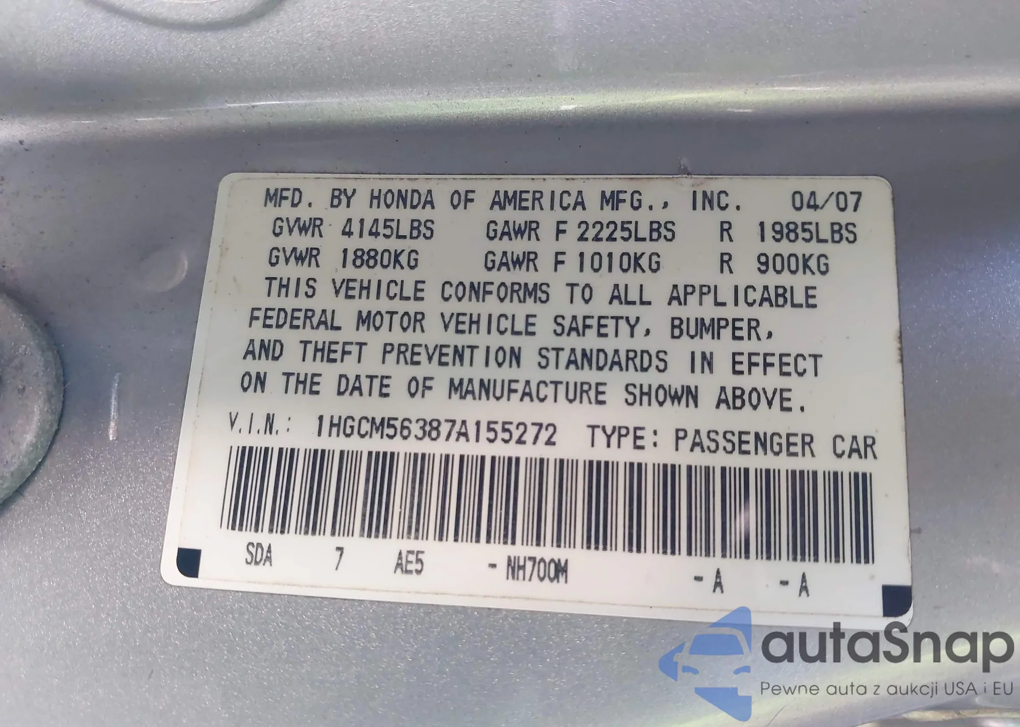 LOT: 44313342 VIN: 1HGCM56387A155272