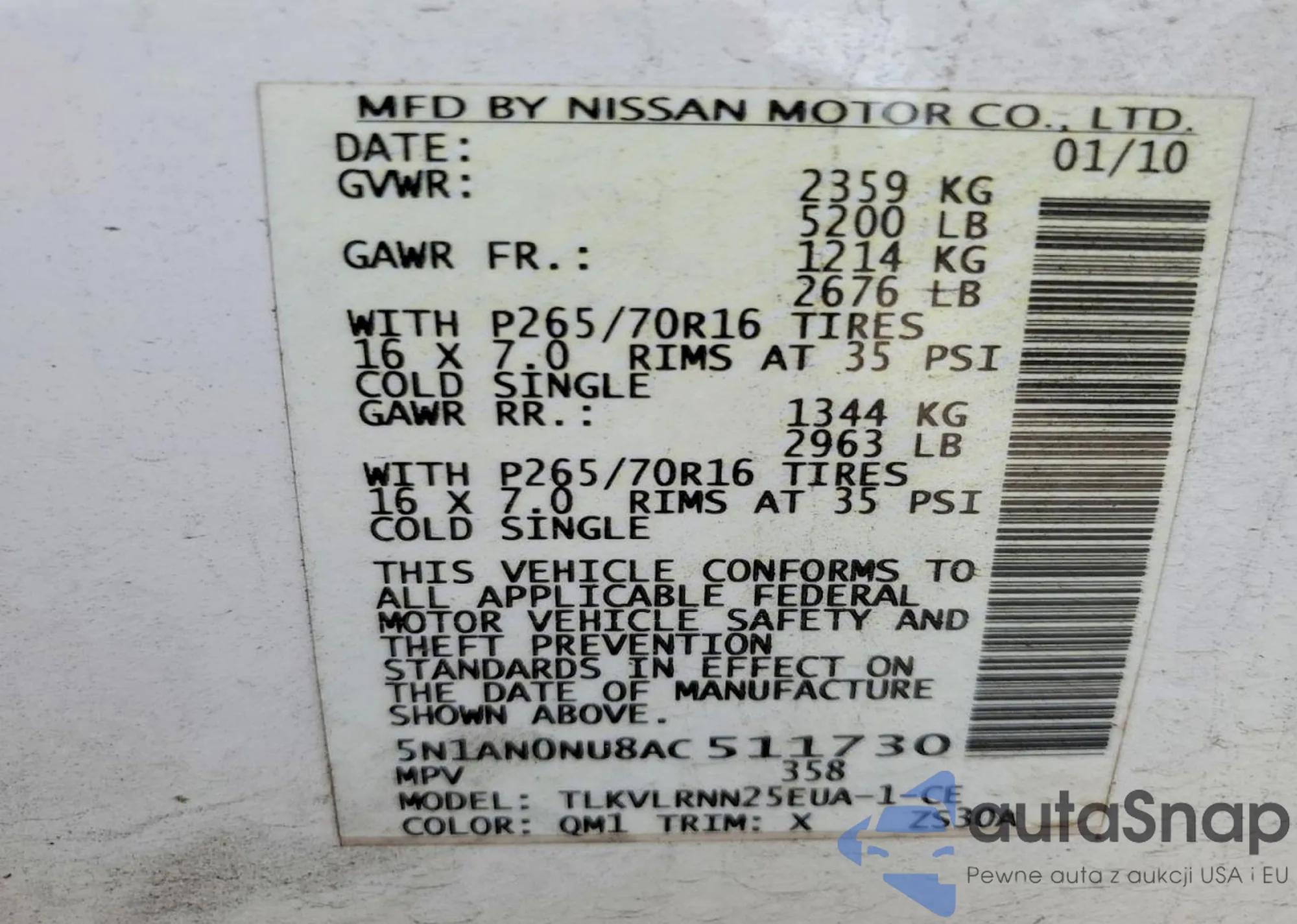 • VIN 5N1AN0NU8AC511730