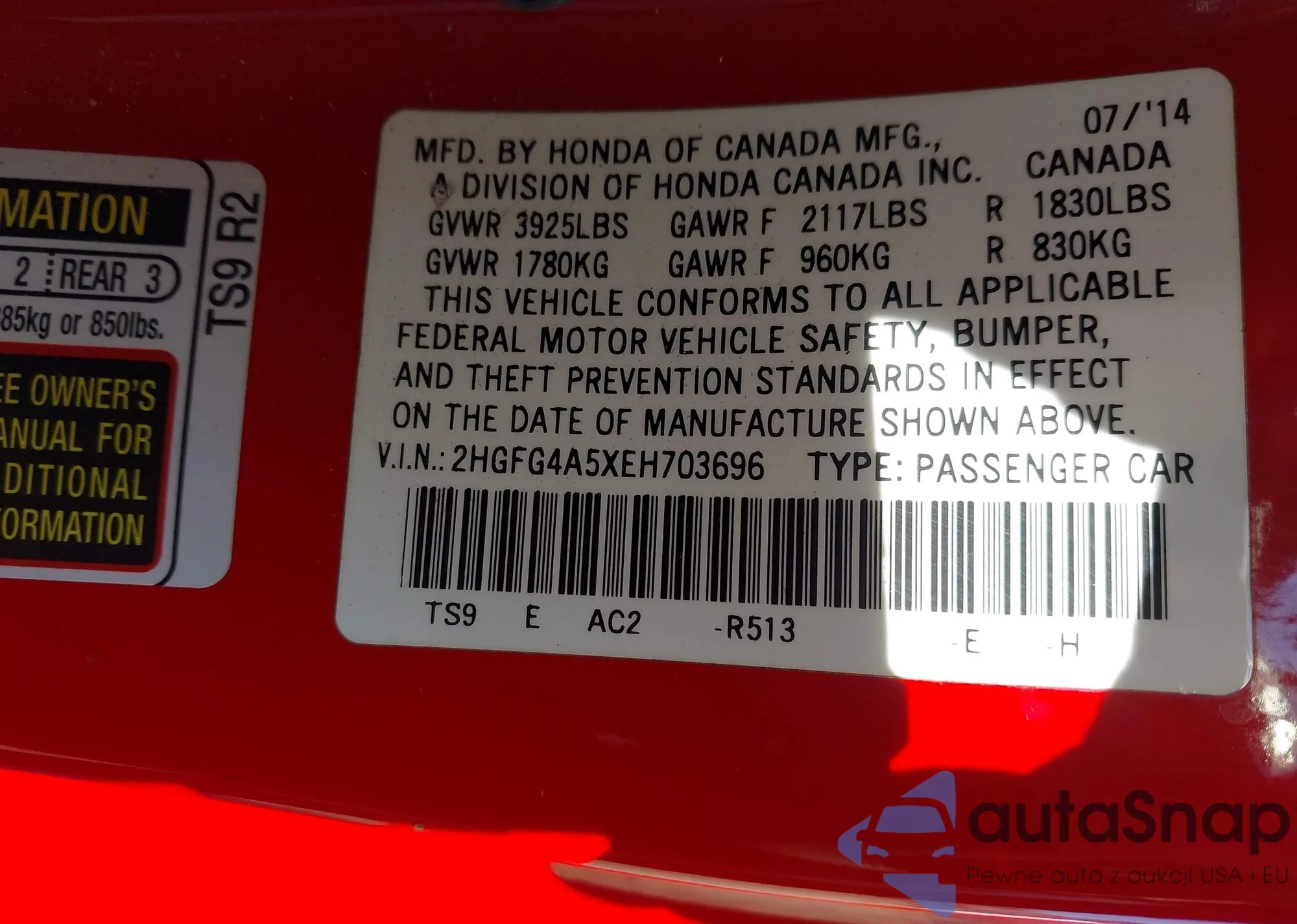 LOT: 43915812 VIN: 2HGFG4A5XEH703696