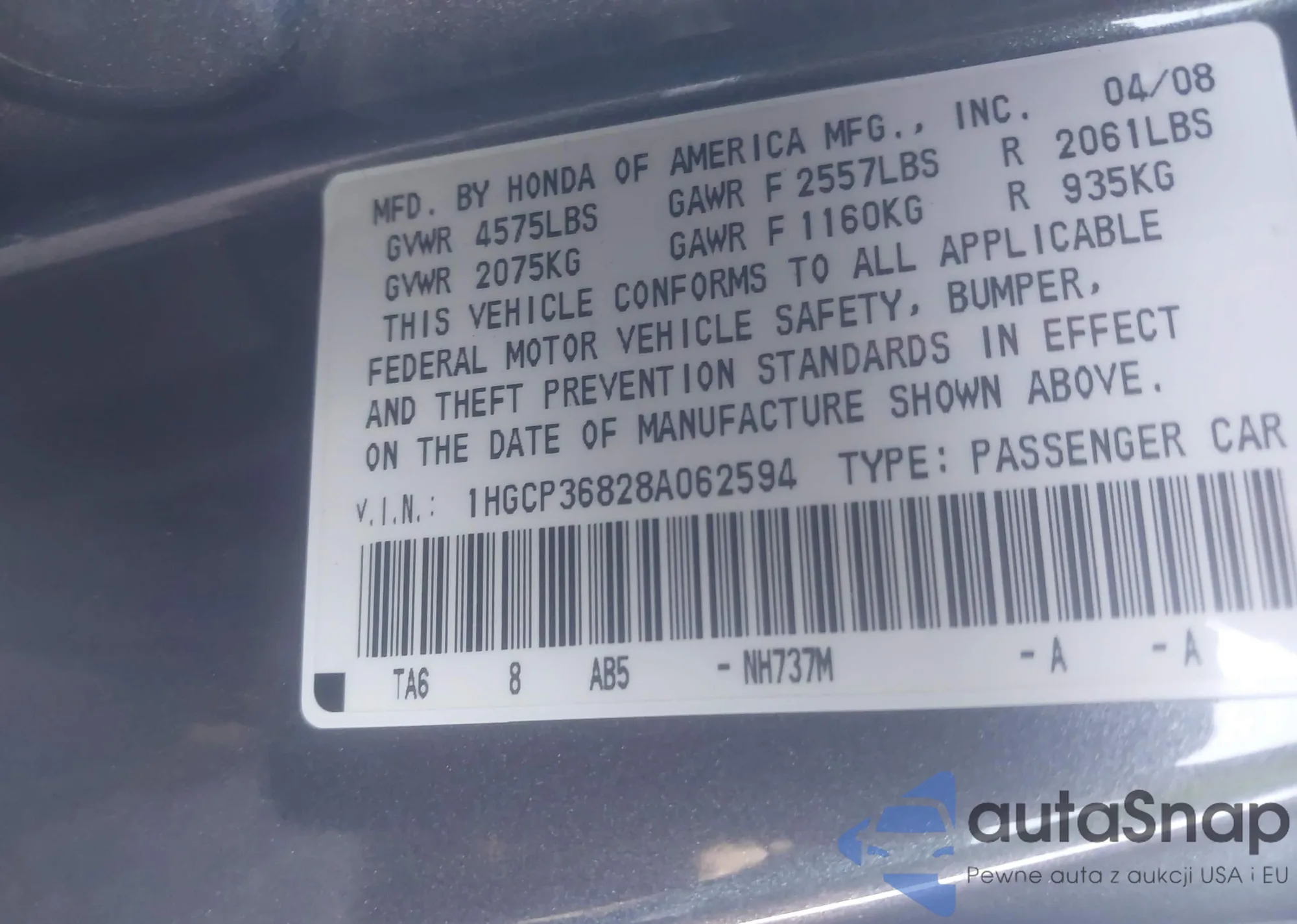 LOT: 44322764 VIN: 1HGCP36828A062594