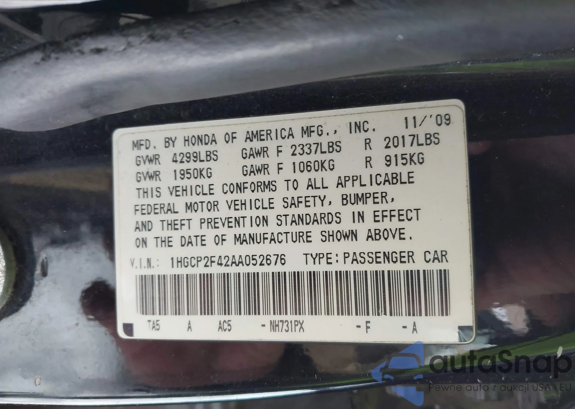 LOT: 44286332 VIN: 1HGCP2F42AA052676