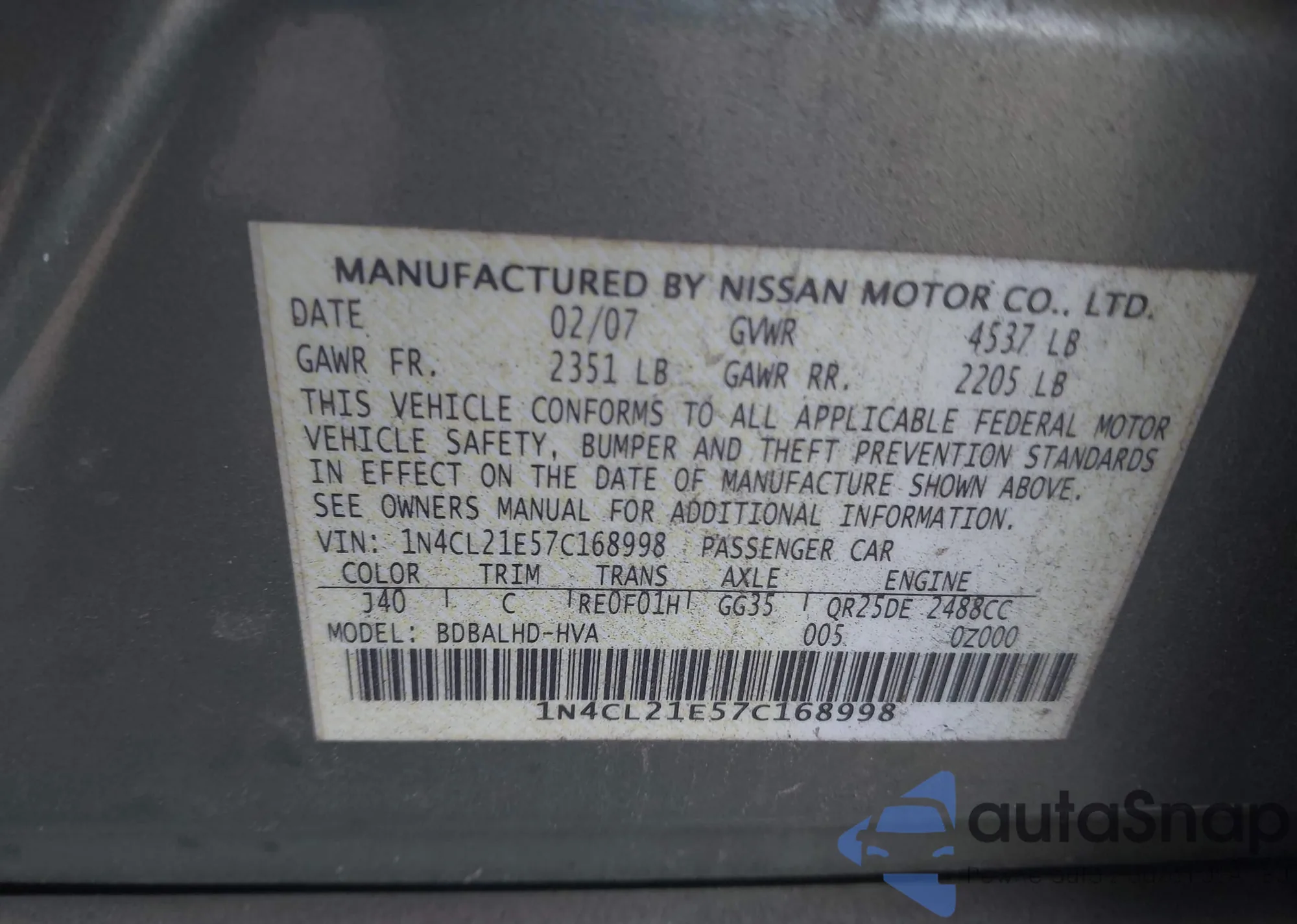 LOT: 44481610 VIN: 1N4CL21E57C168998
