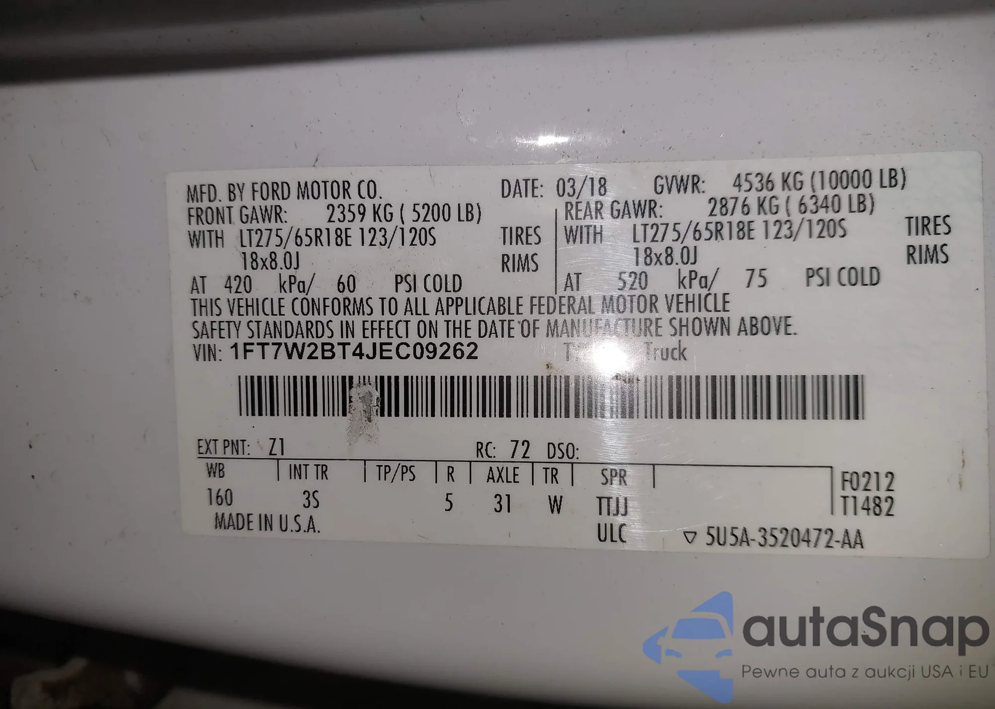 2018 Ford F-250 Xlt z USA, uszkodzony, nr VIN 1FT7W2BT4JEC09262