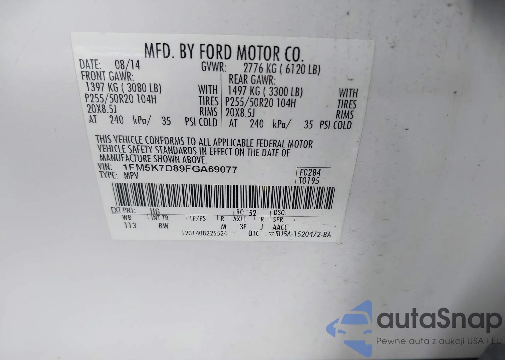 LOT: 43832319 VIN: 1FM5K7D89FGA69077